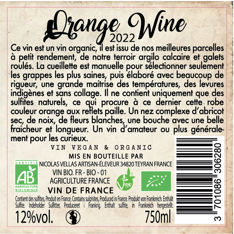 Libellé Vignobles Vellas - Naturellement Pur Orange Wine For The Curious BIO, 2022 - Vin de France - Orange - 75 cl