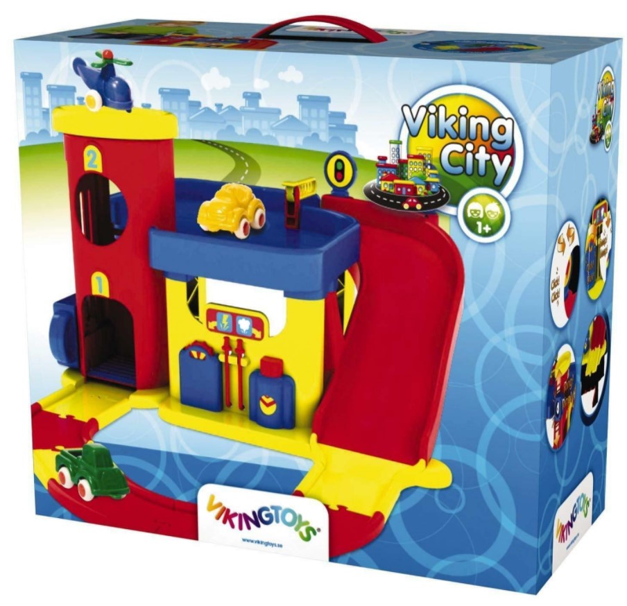 Ce garage Viking Toys propose de nombreuses fonctions : . ascenseur manuel sonore avec système d’éjection de la voiture sur la plateforme supérieure . pompe à essence avec molette qui cliquette . pompe à air pour gonflage . rampes avec rail de guidage central . barrières à ouvrir ou fermer . panneaux à tourner avec cliquetis Accessoires : Fourni avec 2 voitures mini chubbies 7cm, 1 hélicoptère et 7 éléments de routes en plastique incassable. Véhicules et routes lavables au lave-vaiselle. Dès 1 an.