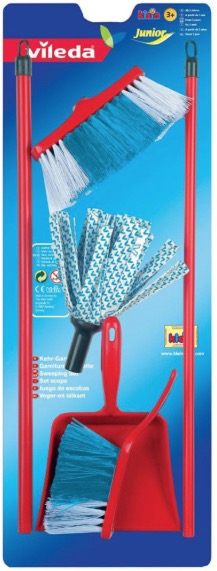 Set Vileda composé de 4 pièces: balai, balai à franges, pelle et balayette. POILS FABRIQUÉS DANS UN MATÉRIAU PET 100% RECYCLÉ ! A partir de 3 ans. Fabriqué en Allemagne
