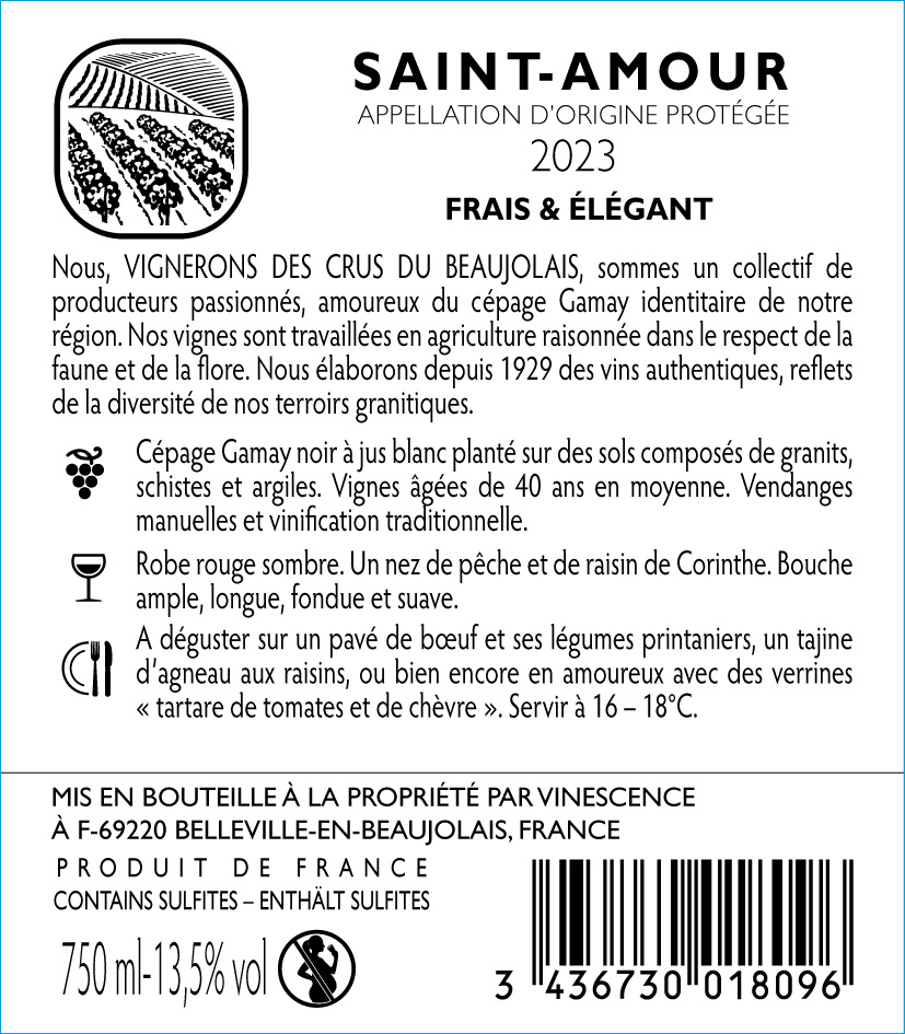| Libellé | Vinescence, 2023 - Saint-Amour AOP - Rouge - 75 cl |