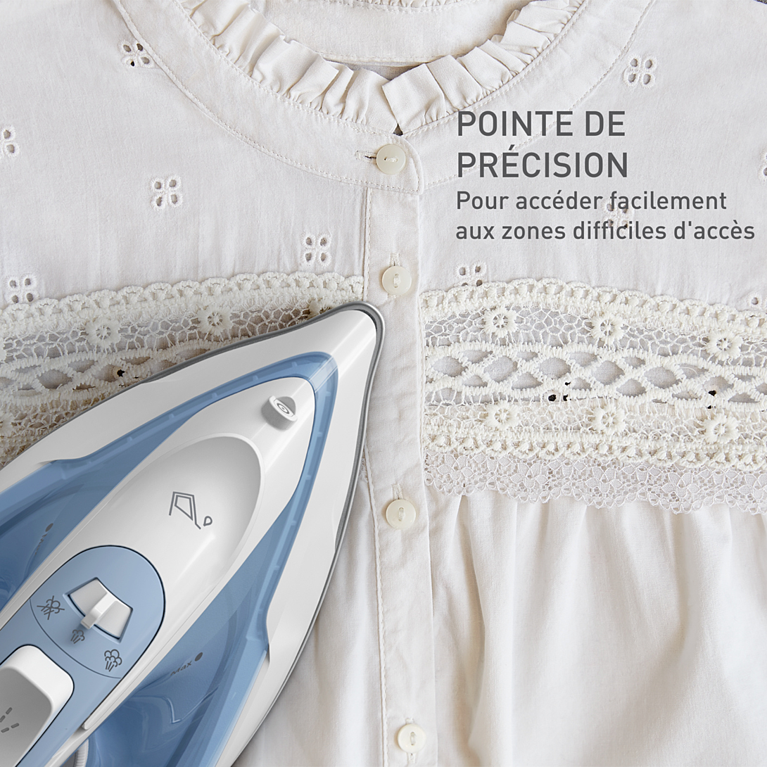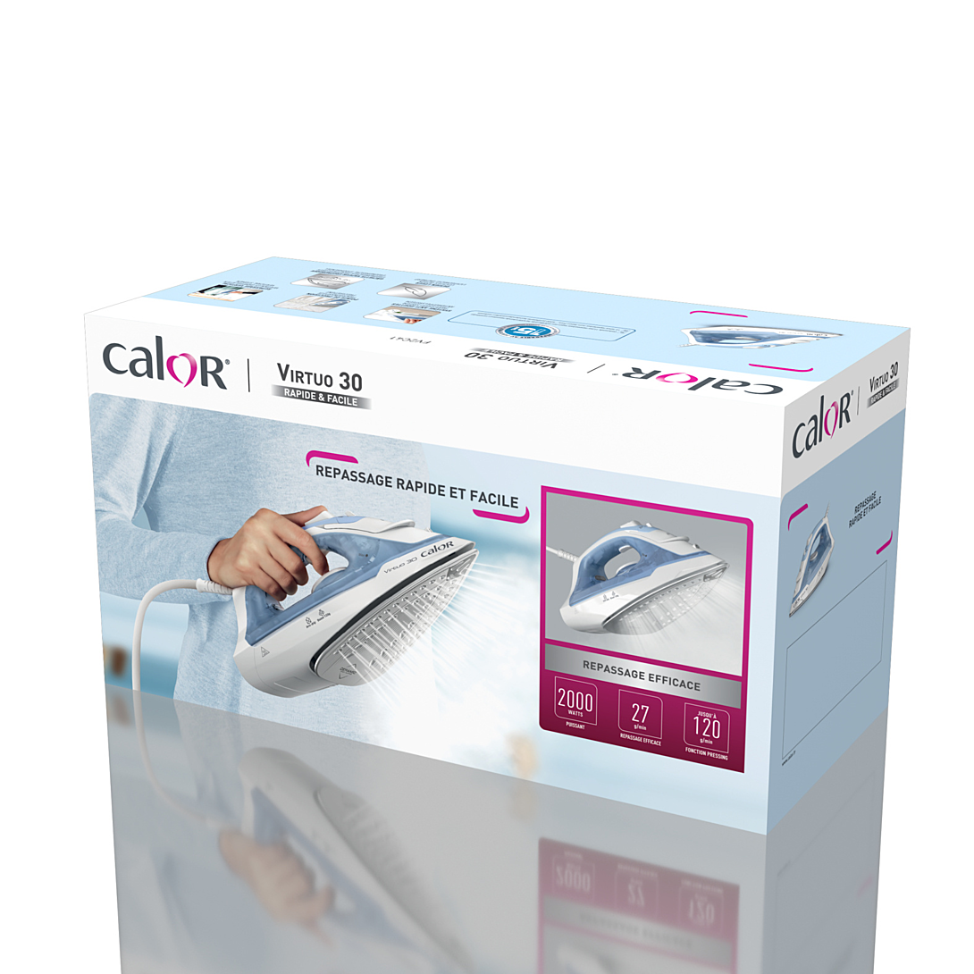 Le fer à repasser Virtuo 30 de Calor offre l'équilibre parfait entre la puissance vapeur et la facilité d'utilisation et promet un repassage parfait. Dotée d'une puissance de 2 000 W pour un temps de chauffe rapide de 30 secondes, ce fer à repasser est équipé de nombreuses fonctions pratiques, du défroissage vertical à la protection anti-goutte. Le tout associé à un débit vapeur continu de 27 g/minute pour un repassage efficace et une fonction pressing de 120 g/minute pour éliminer les plis tenaces.