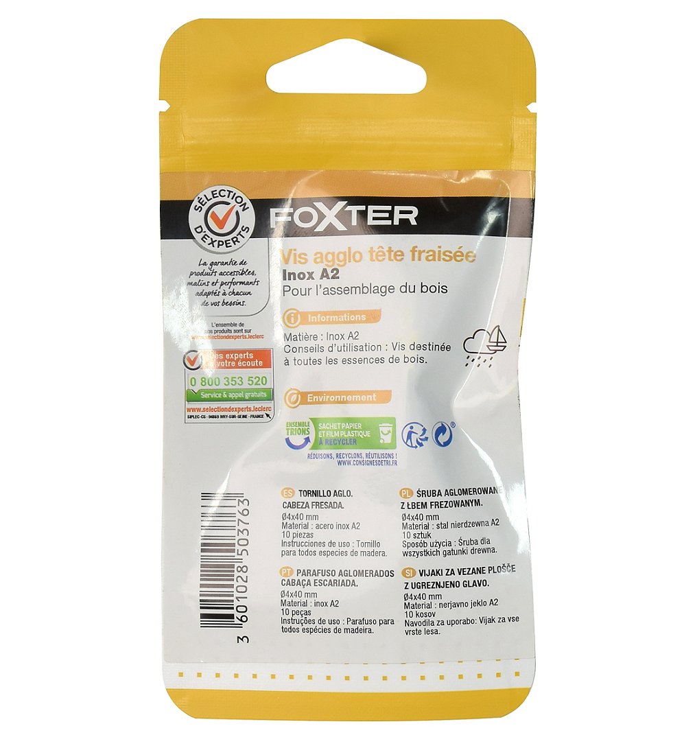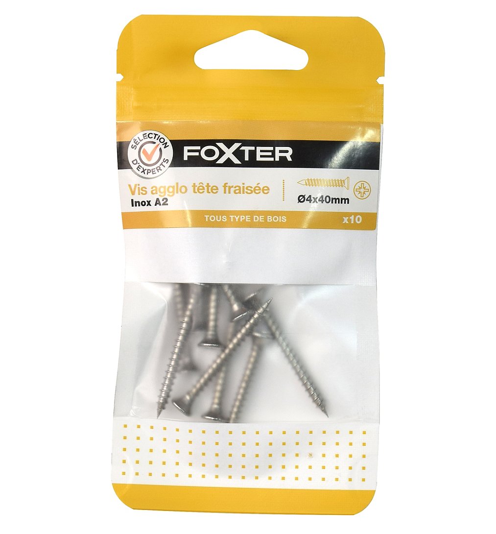 | Libellé | Vis agglo tête fraisée inox A2 4x40mm x10 - Sélection d'Experts - FOXTER |