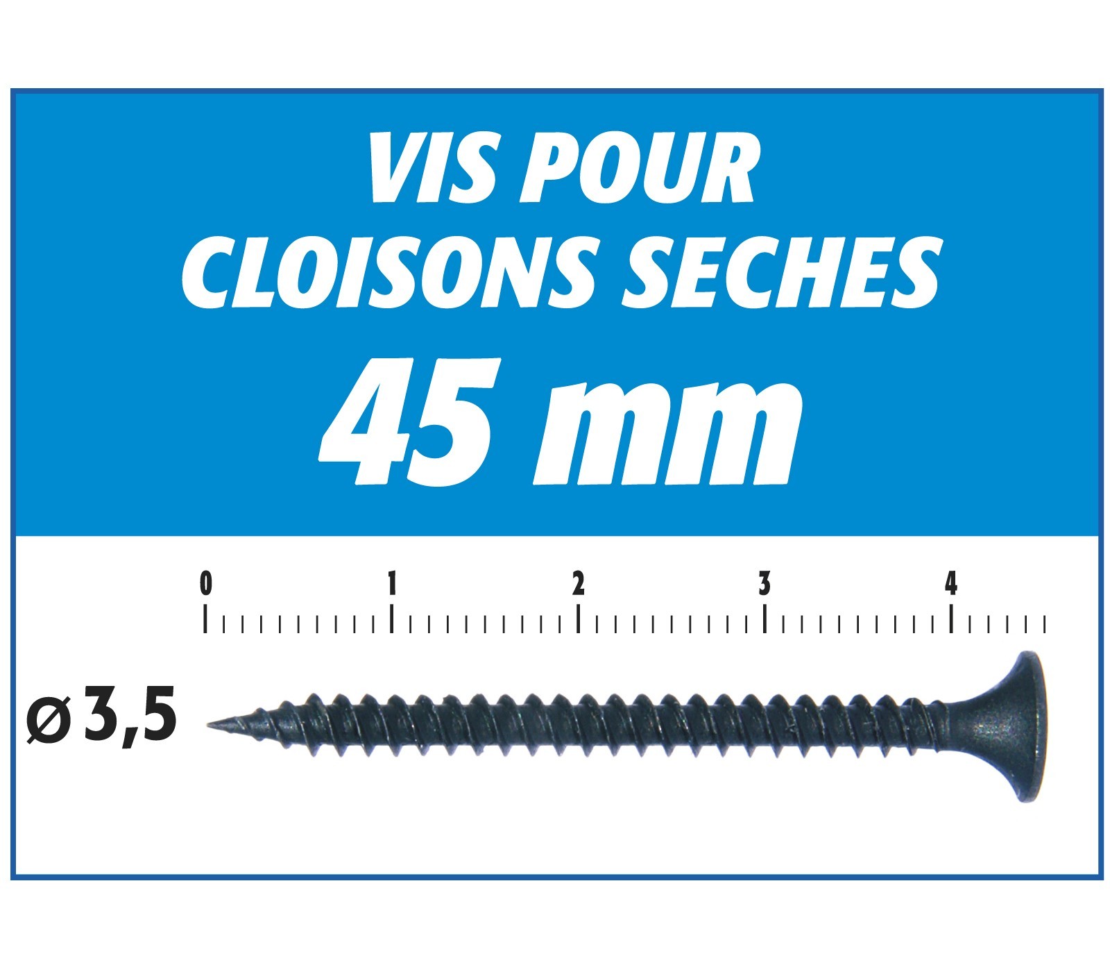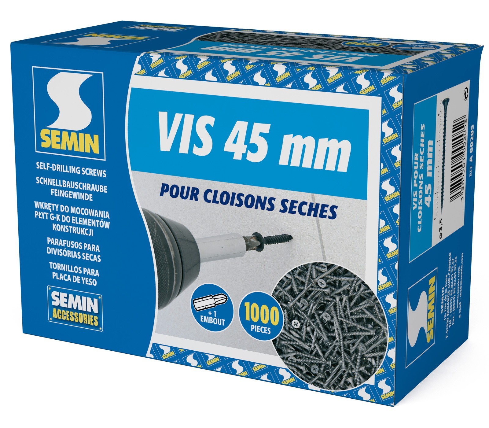 | Libellé | Vis auto perceuse Semin pour la fixation des plaques de plâtre - 45 mm x 3.5 mm - boîte de 1000 pièce |