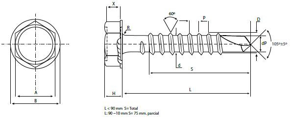Vis auto-perceuse tête Hexagonale avec embase 4,2 x 16 mm (sachet de 500) Dimensions (Ø x long.) : 4.2 x 16 mm Matière : acier zingué C1018~C1022 Dureté : 240~425 HV Dureté de surface : MIN. 560 HV Finition : zingué Epaisseur maxi de serrage : 8.4 mm Epaisseur maxi de perçage : 3 mm Filetage : total L : 13 - 25 mm A (tête) : 7 mm B (embase) (Ø) : 8.8 mm D (Ø) : 4.22 mm d (Ø) : 3.10 mm dp max. (Ø) : 3.60 mm p (pas) : 1.40 mm Sachet de 500 pièces