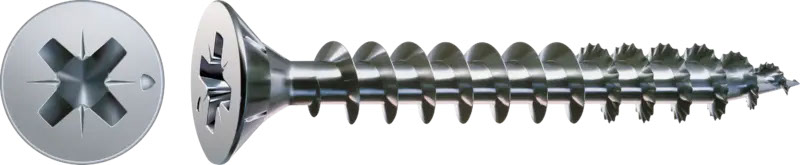 Fabriquée en acier avec un revêtement Wirox de couleur zinguée blanche, cette vis est dotée d'une tête fraisée et d'une empreinte Pozidriv, ce qui la rend adaptée à une variété d'applications. Elle peut être utilisée pour des vissages directs sans nécessiter de pré-perçage (selon le type de bois). L'utilisation de cette vis permet une prévention efficace contre l'éclatement du bois, y compris lors du vissage à proximité des bords.