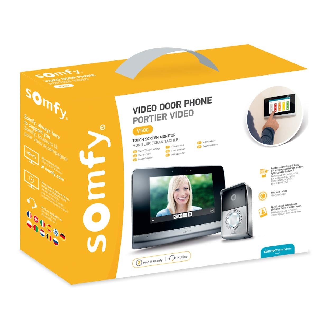 Visiophone Somfy V500 - Contrôle d'accès pour toute la famille Ce visiophone est doté d'une vision grand angle (horizontale 102°, verticale 68°) pour identifier facilement et rapidement les visiteurs qui se présentent. Plus sécurisant qu'une communication uniquement audio, la liaison vidéo permet à tous les membres de la famille de vérifier l'identité des personnes qui demandent l'accès au domicile. Vous pouvez ouvrir à vos visiteurs depuis le moniteur tactile intérieur puisque l'interphone V500 gère l'ouverture de portail ou d'une gâche électrique. Interphone vidéo avec fonctionnalités additionnelles L'interface intuitive et ergonomique de ce visiophone donne accès aux principales fonctionnalités : réponse au visiteur, ouverture de portail, intercom avec un second moniteur. Ces fonctions sont complétées par d'autres informations comme les photos des visiteurs qui se sont présentés durant votre absence ou encore la température intérieure et extérieure. Ce moniteur Somfy intègre également une commande sans fil qui pilote à distance jusqu'à 5 produits (ou groupes de produits) Somfy RTS (volets roulants, lumières...).