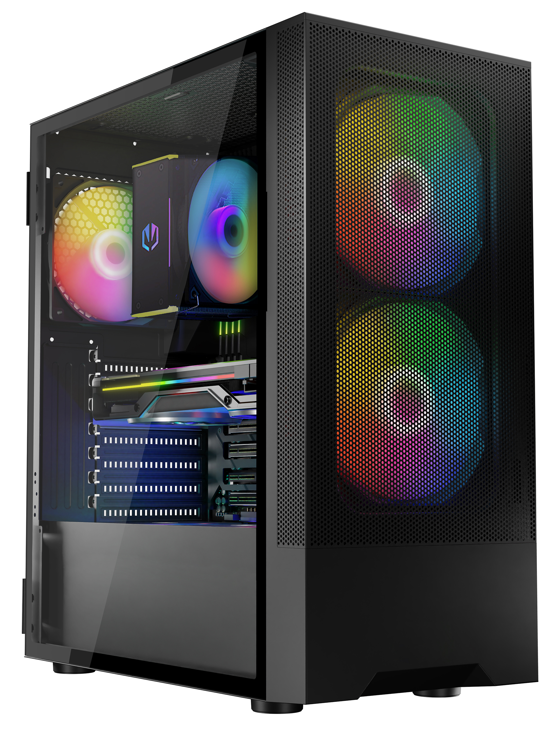 Logic ARYA est un boîtier conçu pour construire un ordinateur de jeu moderne. Trois ventilateurs ARGB préinstallés, un filtre sous l'alimentation et une porte latérale en verre trempé.