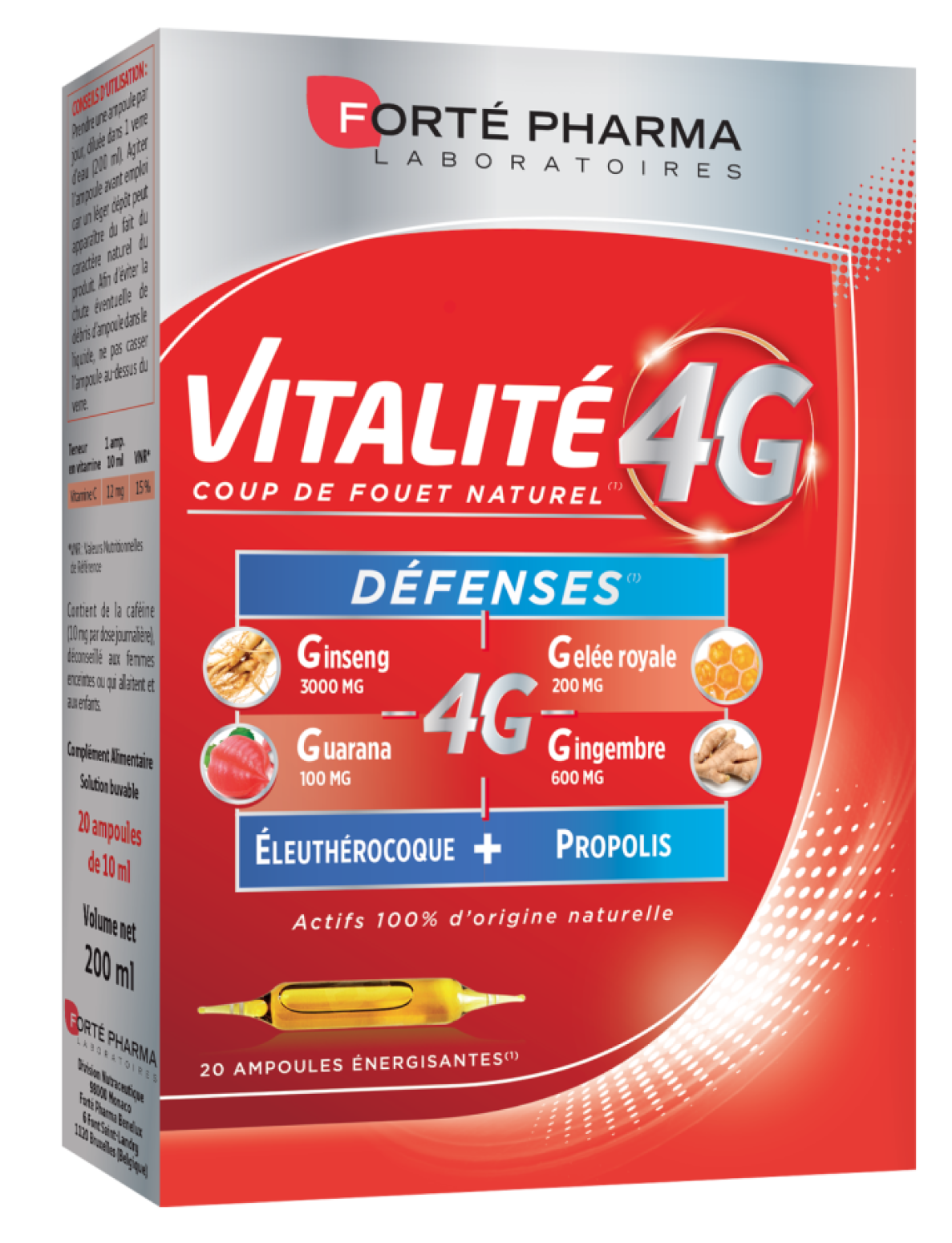 Rythme de vie soutenu, désagréments hivernaux divers, période de surmenage: toutes ces situations épuisent l'organisme. Celui-ci devient alors plus vulnérable aux agressions extérieures. Il est donc essentiel de garder tonus et vitalité pour se prémunir des petits maux de l'hiver. La formule Vitalité 4G Défenses se base sur le complexe d'actifs 4G, une synergie de 4 plantes idéalement dosées : Ginseng, Guarana, Gelée Royale et Gingembre. Ces actifs sont associés à de l’acérola, baie des Antilles riche en vitamine C, pour booster votre énergie(1). Deux ingrédients viennent compléter la formule pour stimuler le système immunitaire : L'éleuthérocoque : tonifiant général de l’organisme, il contribue au fonctionnement normal du système immunitaire. La propolis : produite par les abeilles, cette résine naturelle permet de protéger la ruche des agressions extérieures. Vitalité 4G Défenses vous permet de faire le plein de vitalité tout en boostant vos défenses naturelles ! (1)La vitamine C contribue à réduire la fatigue et à maintenir le fonctionnement normal du système immunitaire. Complément alimentaire Laboratoires Forté Pharma SAM, 41 avenue Hector Otto, le Patio Palace, 98 000 MONACO
