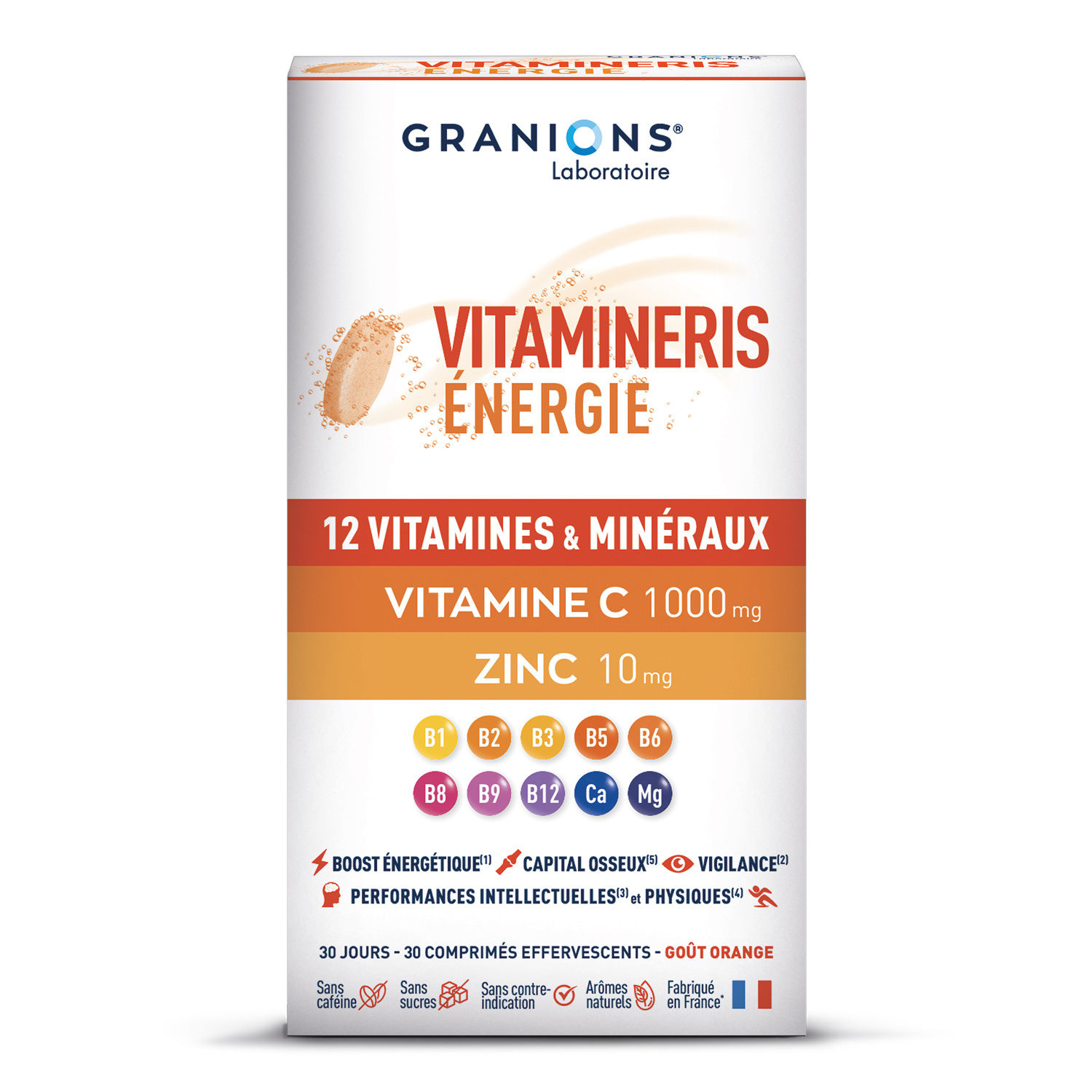 Granions Vitamineris Énergie 1000 mg 30 Comprimés Effervescents est un complément alimentaire qui contient un concentré de 9 vitamines et 3 minéraux pour soutenir votre forme physique et mentale au quotidien. La vitamine C contribue à réduire la fatigue et à un métabolisme énergétique normal. Elle aide à un fonctionnement normal du système nerveux et à lutter contre le stress oxydatif. Le zinc contribue à une fonction cognitive normale ainsi qu'à la lutte contre le stress oxydatif. La vitamine B5 contribue à des performances intellectuelles normales et à la synthèse normale des neurotransmetteurs. Le magnésium contribue à une fonction musculaire normale et au maintien de fonctions psychologiques normales. Goût orange. Sans caféine, sans gluten, sans lactose, sans colorant artificiel, sans sucres, sans conservateur. Fabriqué en France.