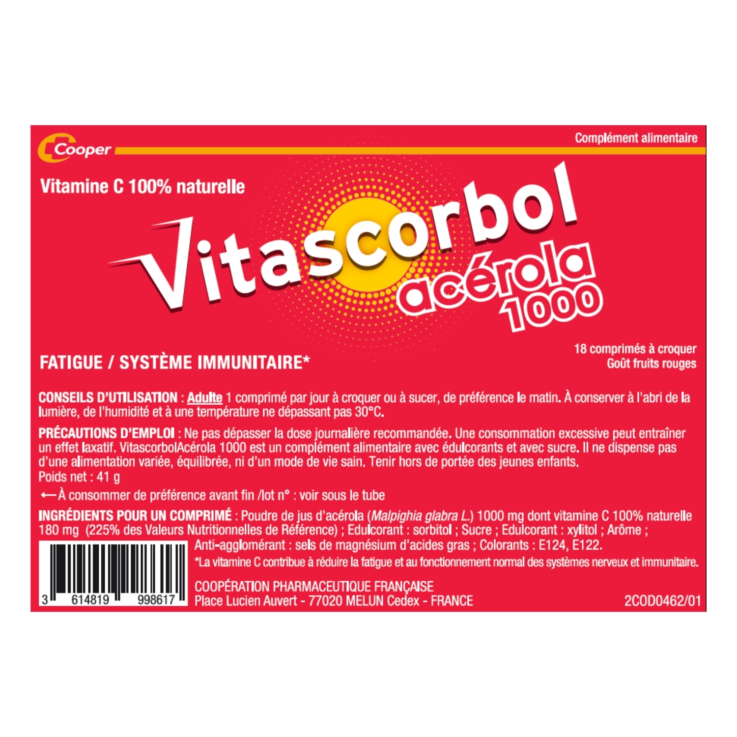 "VitascorbolAcérola 1000 est un complément alimentaire à base de vitamine C 100% naturelle, 100% issue de l’acérola. Les 1000 mg d’acérola contenus dans VitascorbolAcérola 1000 apportent 180 mg de vitamine C, soit 225% des Valeurs Nutritionnelles de Référence. La vitamine C contribue à réduire la fatigue et au fonctionnement normal des systèmes nerveux et immunitaire."