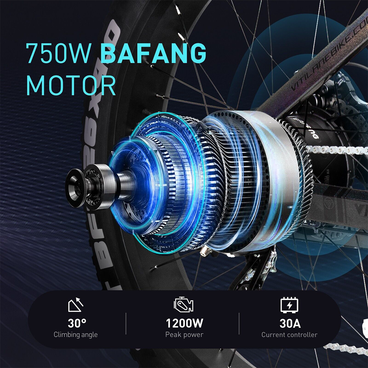 Moteur : Moteur Bafang 750 W (crête 1200 W), 80 Nm