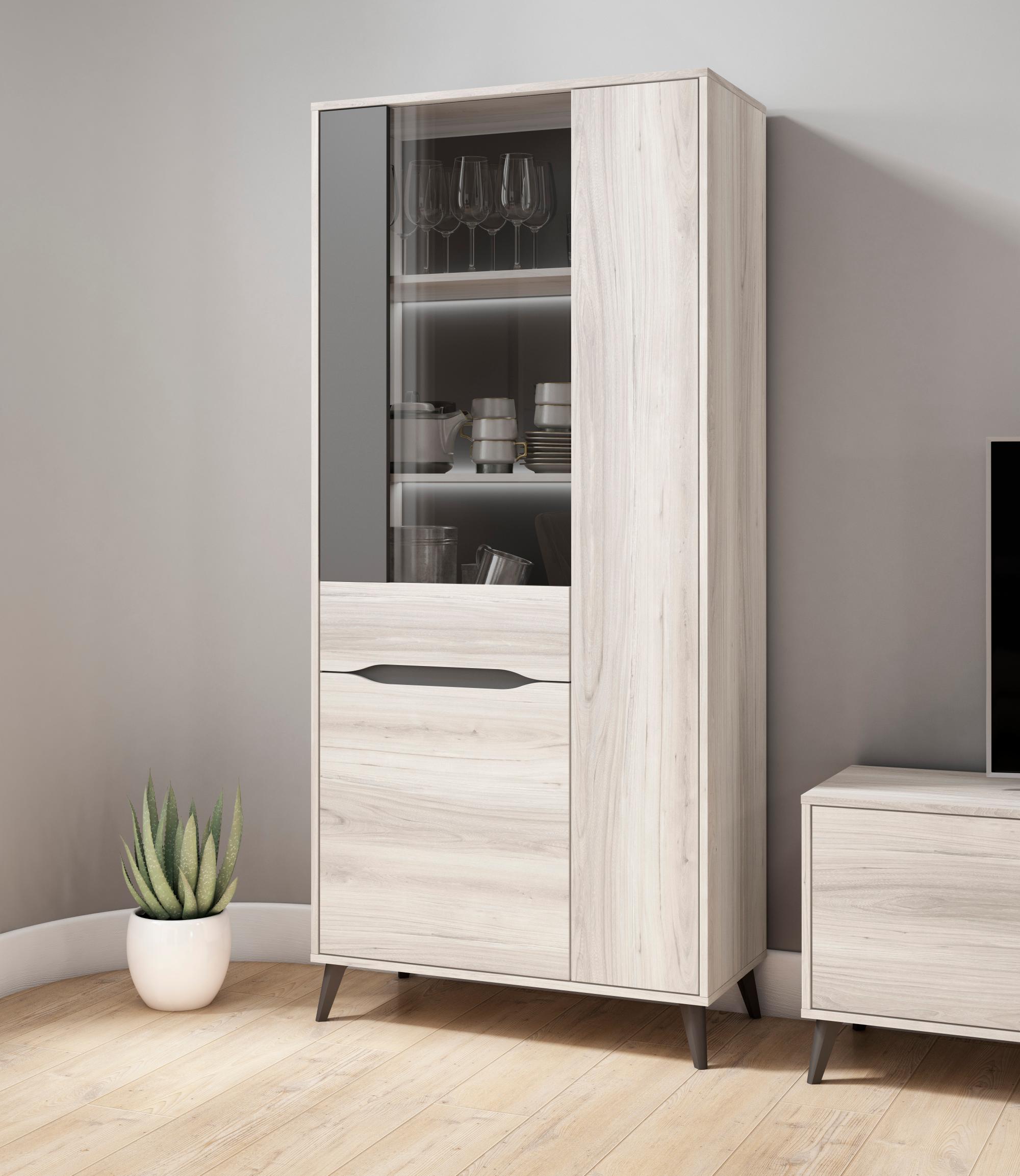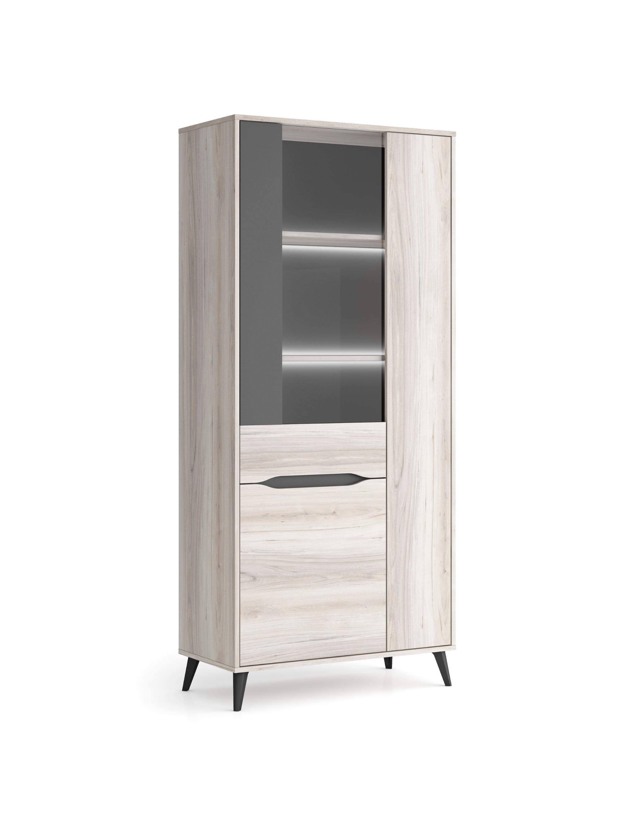 Vitrine 3 portes, Ilumination LED inclus, Couleur Chêne, Gris. Mesures: 83.4 Largeur x 40cm profondeur x