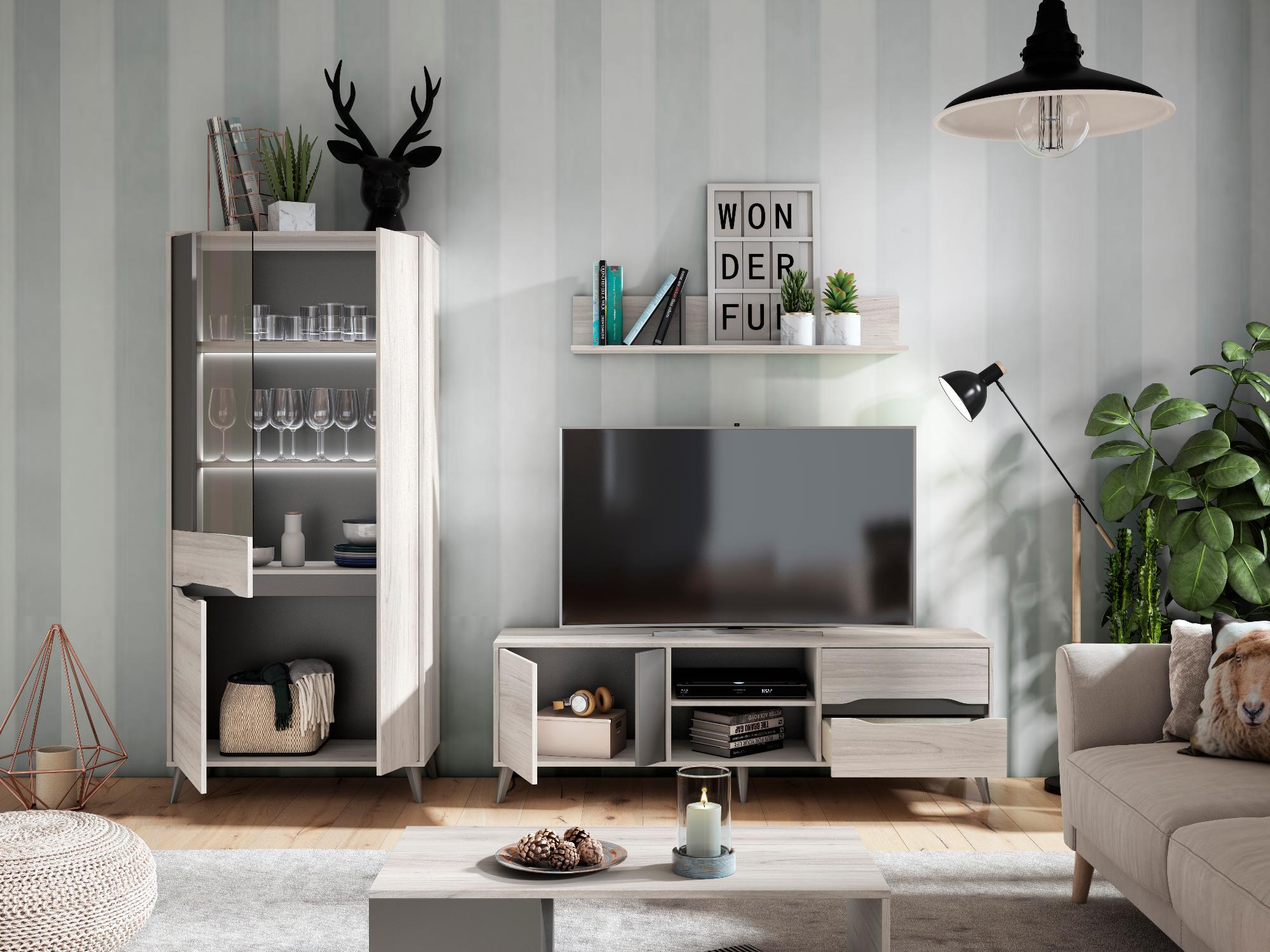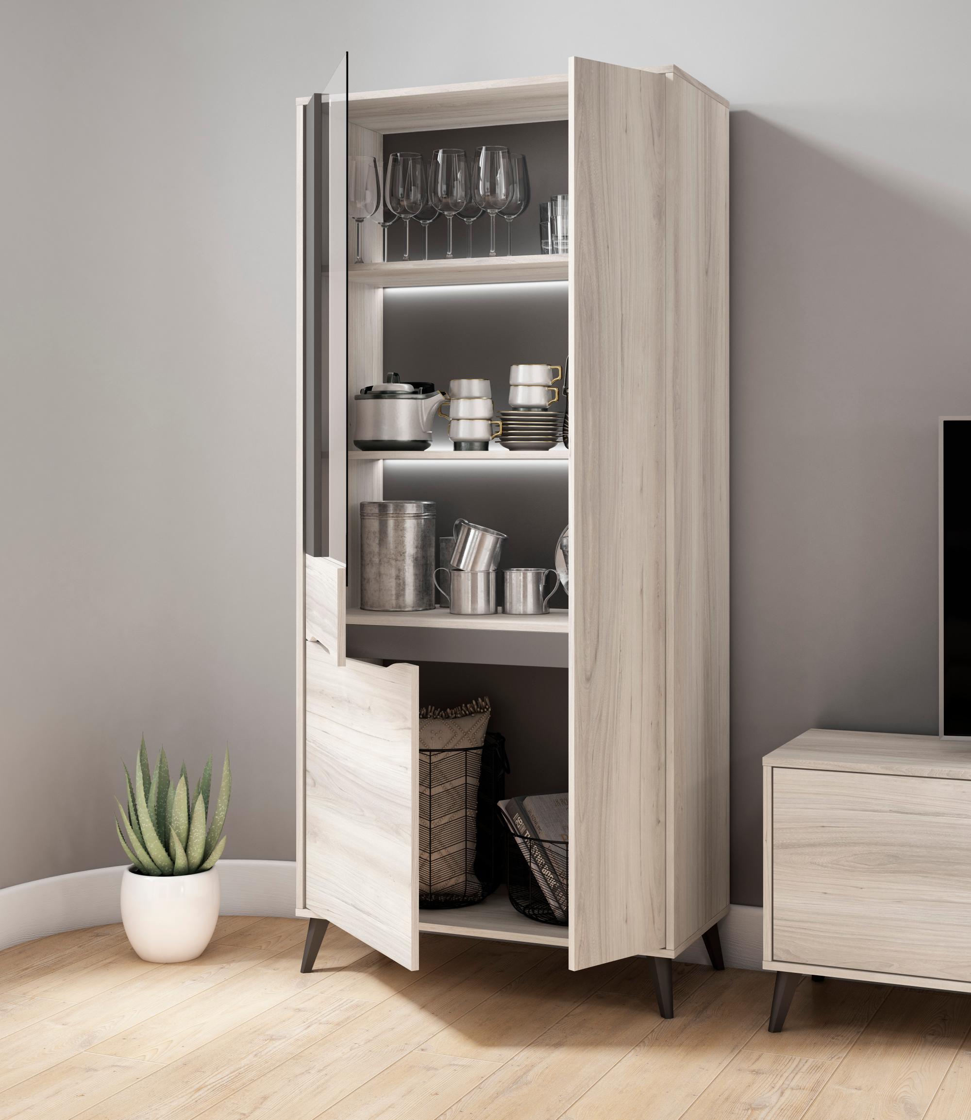 | Libellé | Vitrine 3 portes, Ilumination LED inclus, Couleur Chêne, Gris. Mesures: 83.4 Largeur x 40cm profondeur x 185cm |