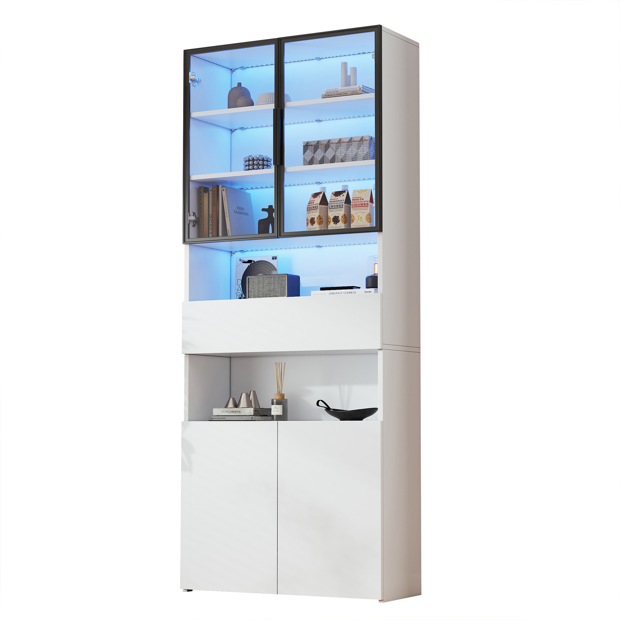 Dimensions hors tout : 70 x 30 x 200 cm. Vitrine avec deux portes vitrées avec cadre en aluminium, un tiroir et un meuble bas. L’intérieur de la vitrine est divisé en deux niveaux et offre deux étagères ouvertes. Vous pouvez vous tenir debout à côté de la vitrine pour boire un verre et discuter. Grâce à des lumières LED contrôlées via une application mobile, elle crée une ambiance chaleureuse pour les réunions et les fêtes. La vitrine est fabriquée en panneaux de particules avec une capacité de charge recommandée de 150 kg. Elle est de couleur blanche.