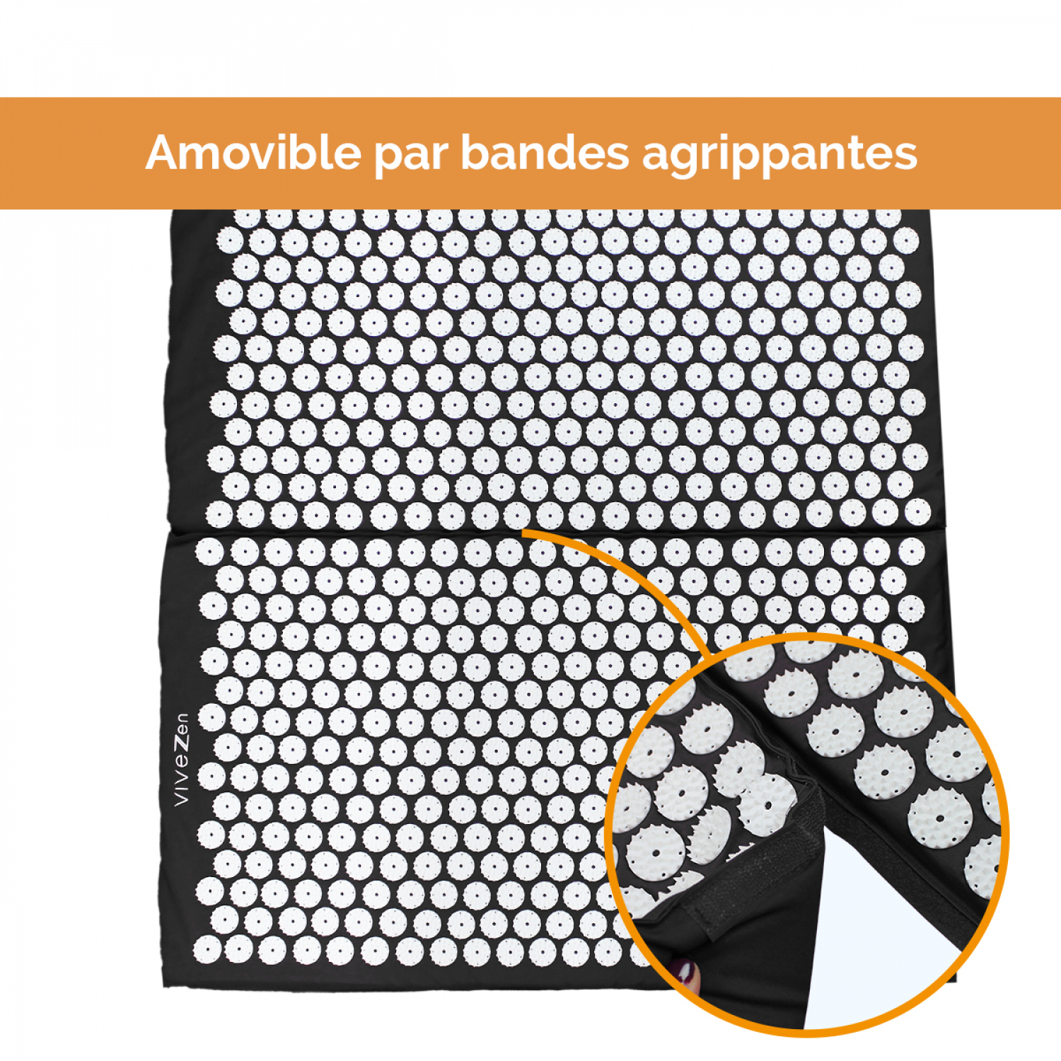 Quoi de mieux qu'une séance de relaxation qui cible toutes les zones du corps en même temps ? Gagnez du temps avec notre kit d'acupression modulable Vivezen. Il est composé de deux tapis d'acupression modulables de 89,5 x 50 cm qui forment, grâce à une bande agrippante invisible, un tapis de 100 x 89,5 cm. Il rassemble à lui seul 646 oillets pour 33 points d'acupression. Votre tapis d'acupression s'adaptera à l'utilisation que vous en faites. Allongé sur le sol, le canapé, une chaise. Il s'adapte à toutes les morphologies. Vous y trouverez également un oreiller d'acupression de 40 x 30 x 9,5 cm, qui, grâce à sa fonction mémoire de forme, épouse parfaitement les zones ciblées comme le cou, le creux des jambes et les lombaires. 27 points d'acupression pour 66 oillets. Dans ce kit se trouve également un tapis d'acupression pour pieds, les oillets sont disposés de telle sorte qu'il épouse parfaitement la forme de vos pieds. Laissez-vous aller à l'apaisement, prenez pleine conscience de votre corps et relaxez-vous avec votre kit d'acupression Vivezen. Les matériaux sont : Housse : Coton + bande agrippante Picots : Abs plastique non toxique Intérieur tapis pied et corps : Mousse dense Intérieur oreiller : Mousse à mémoire de forme Composition du kit : - Oreiller d'acupression mémoire de forme 40 x 30 x 9,5 cm 27 points d'acupression pour 66 oillets. - Tapis d'acupression 100 x 89,5 cm - 2 tapis de 50 x 89,5 cm reliés par une bande agrippante Et son sac de transport noir 33 points d'acupression pour 323 ½illets par tapis (646 ½illets assemblés) - Tapis pour pieds d'acupression 32.5 x 35.5 x 5 cm 33 points acupression pour 62 ½illets.