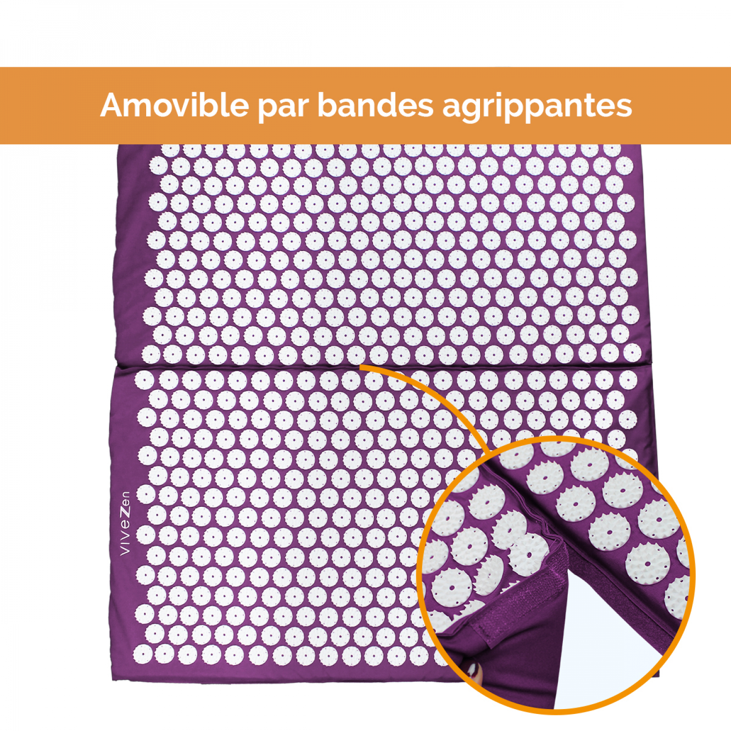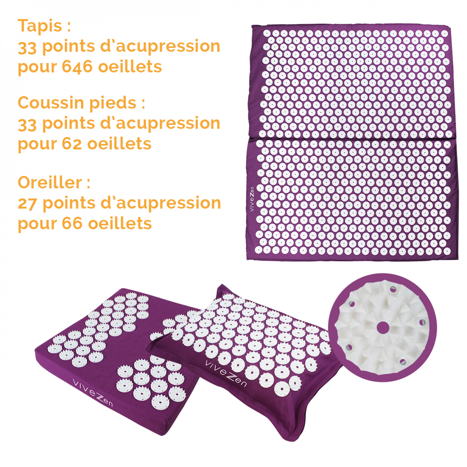 Quoi de mieux qu'une séance de relaxation qui cible toutes les zones du corps en même temps ? Gagnez du temps avec notre kit d'acupression modulable Vivezen. Il est composé de deux tapis d'acupression modulables de 89,5 x 50 cm qui forment, grâce à une bande agrippante invisible, un tapis de 100 x 89,5 cm. Il rassemble à lui seul 646 oillets pour 33 points d'acupression. Votre tapis d'acupression s'adaptera à l'utilisation que vous en faites. Allongé sur le sol, le canapé, une chaise. Il s'adapte à toutes les morphologies. Vous y trouverez également un oreiller d'acupression de 40 x 30 x 9,5 cm, qui, grâce à sa fonction mémoire de forme, épouse parfaitement les zones ciblées comme le cou, le creux des jambes et les lombaires. 27 points d'acupression pour 66 oillets. Dans ce kit se trouve également un tapis d'acupression pour pieds, les oillets sont disposés de telle sorte qu'il épouse parfaitement la forme de vos pieds. Laissez-vous aller à l'apaisement, prenez pleine conscience de votre corps et relaxez-vous avec votre kit d'acupression Vivezen. Les matériaux sont : Housse : Coton + bande agrippante Picots : Abs plastique non toxique Intérieur tapis pied et corps : Mousse dense Intérieur oreiller : Mousse à mémoire de forme Composition du kit : - Oreiller d'acupression mémoire de forme 40 x 30 x 9,5 cm 27 points d'acupression pour 66 oillets. - Tapis d'acupression 100 x 89,5 cm - 2 tapis de 50 x 89,5 cm reliés par une bande agrippante Et son sac de transport noir 33 points d'acupression pour 323 ½illets par tapis (646 ½illets assemblés) - Tapis pour pieds d'acupression 32.5 x 35.5 x 5 cm 33 points acupression pour 62 ½illets.