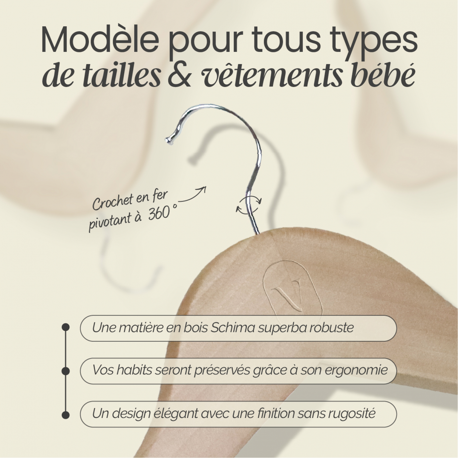 | Libellé | Vivezen - Lot de 10 cintres 28.5 cm pour vêtements bébé avec crochet pivotant à 360° - Bois clair |