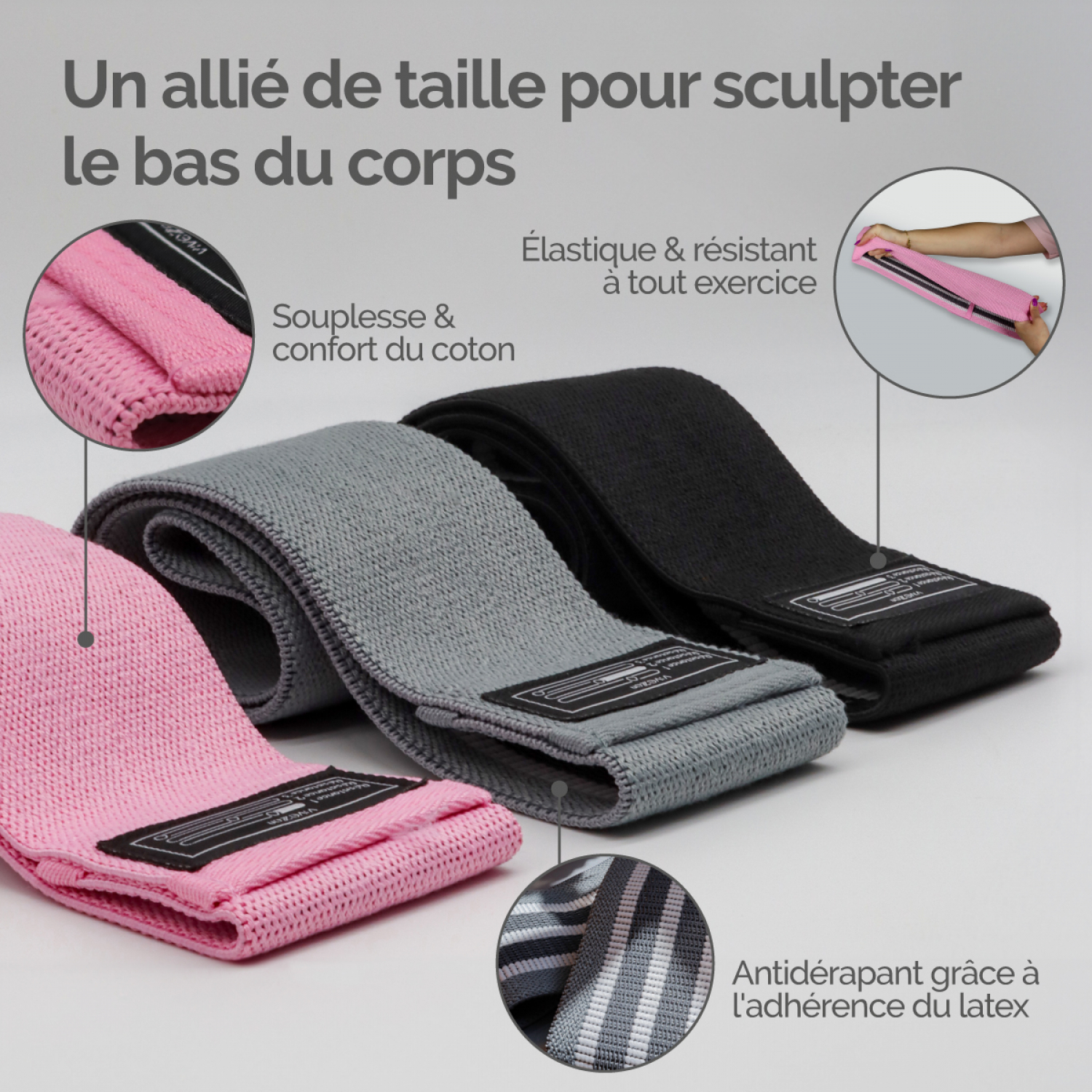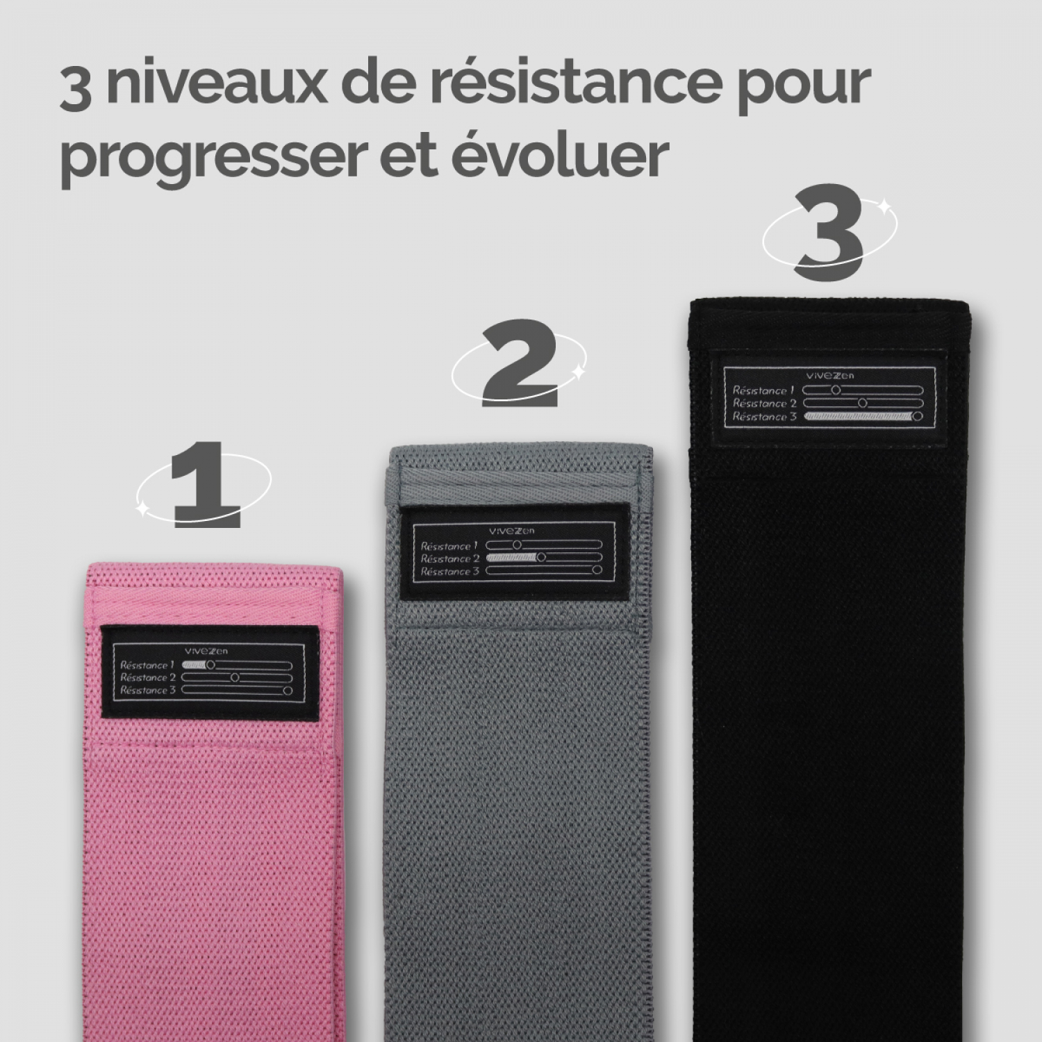 | Libellé | Vivezen - Lot de 3 élastiques de résistance pour musculation, fitness, pilates - Rose, gris, noir |