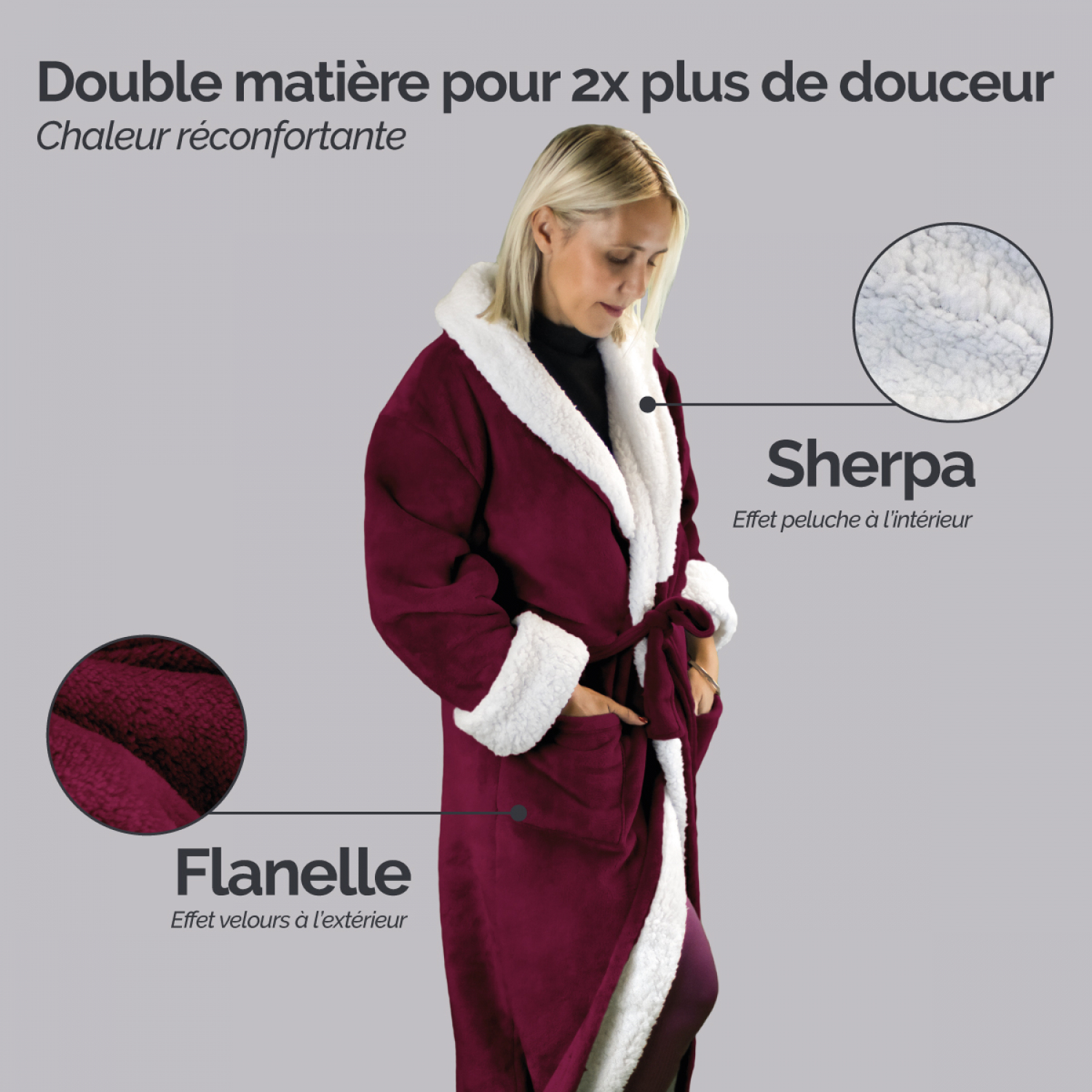 Idéale à la sortie de votre lit ou sur le canapé près du feu de cheminée, la robe de chambre polaire Vivezen sera votre alliée des nuits d’hiver. Soyeuse et confortable, elle est également parfaite pour un moment de réconfort cocooning. Moelleuse et chaude, impossible de vous séparer de la robe de chambre polaire qui se compose de deux couches. Délicate comme du velours grâce à la flanelle à l’extérieur, et douce comme une peluche grâce au sherpa à l’intérieur. À l’aide de ses deux larges poches de côté, vous pouvez transporter votre portable ou garder vos mains au chaud en toute sérénité. Grâce à son col moelleux, votre cou est protégé du froid. Cette robe de chambre est proposée en deux tailles. S/M : La robe de chambre mesure environ 117 cm en longueur, 156 cm d’envergure en largeur et 56 cm de longueur de manches. L/XL : La robe de chambre mesure environ 127 cm en longueur, 178 cm d’envergure en largeur et 66 cm de longueur de manches. Se lave en machine en programme doux à 30°C. Plusieurs coloris et tailles disponibles.