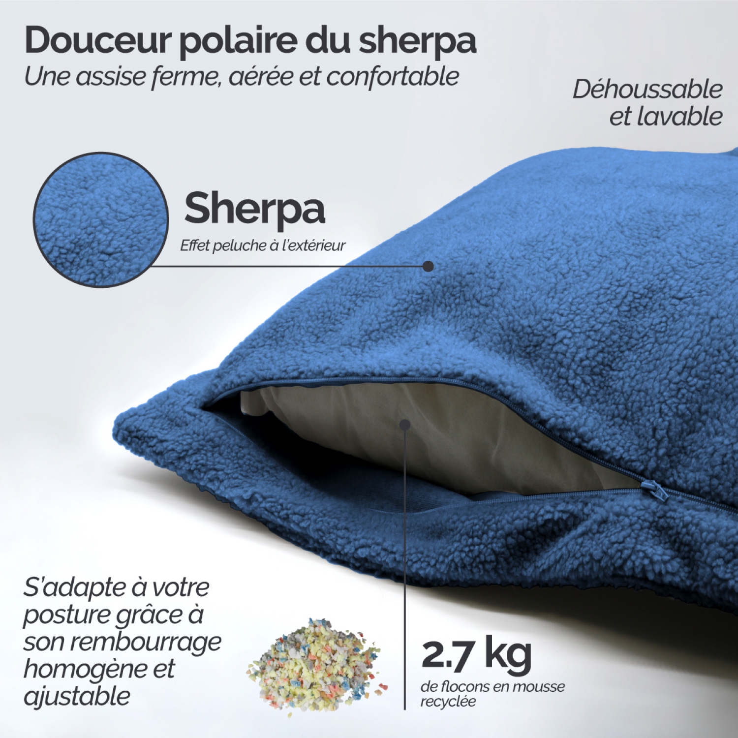 | Libellé | Vivezen - Pouf, fauteuil d'intérieur déhoussable - 90 x 140 cm - Sherpa - Bleu marine |