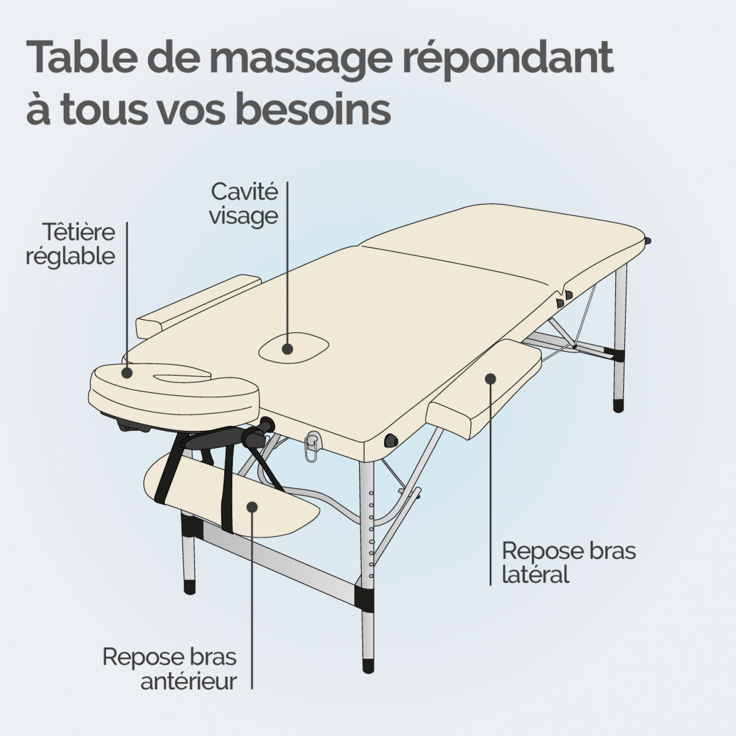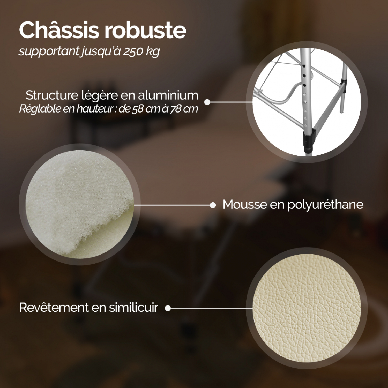 | Libellé | Vivezen - Table de massage pliante 2 zones en aluminium + Accessoires et housse de transport - Beige |