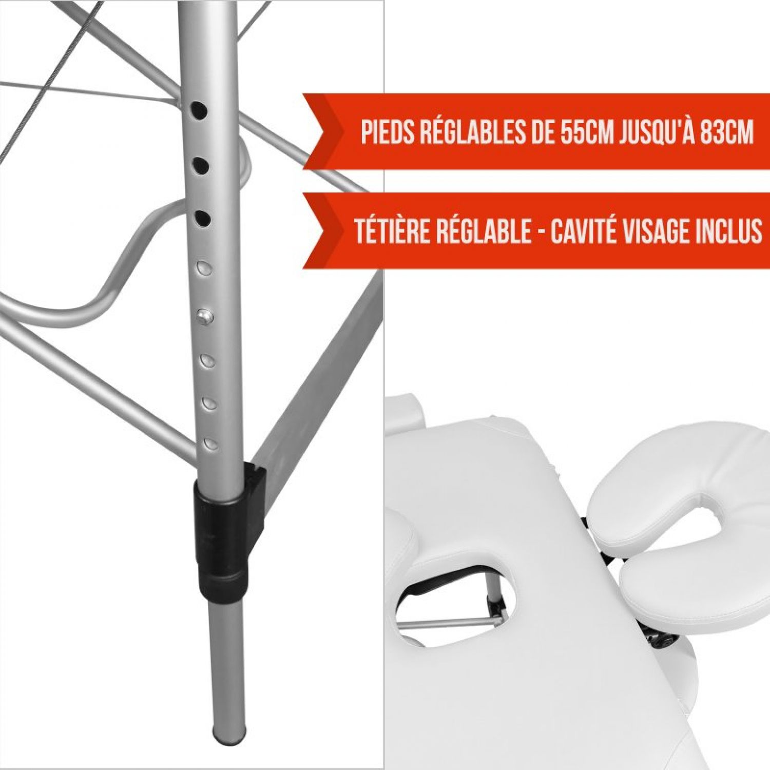 Vivezen - Table de massage pliante 2 zones en aluminium + Accessoires et housse de transport - Blanc