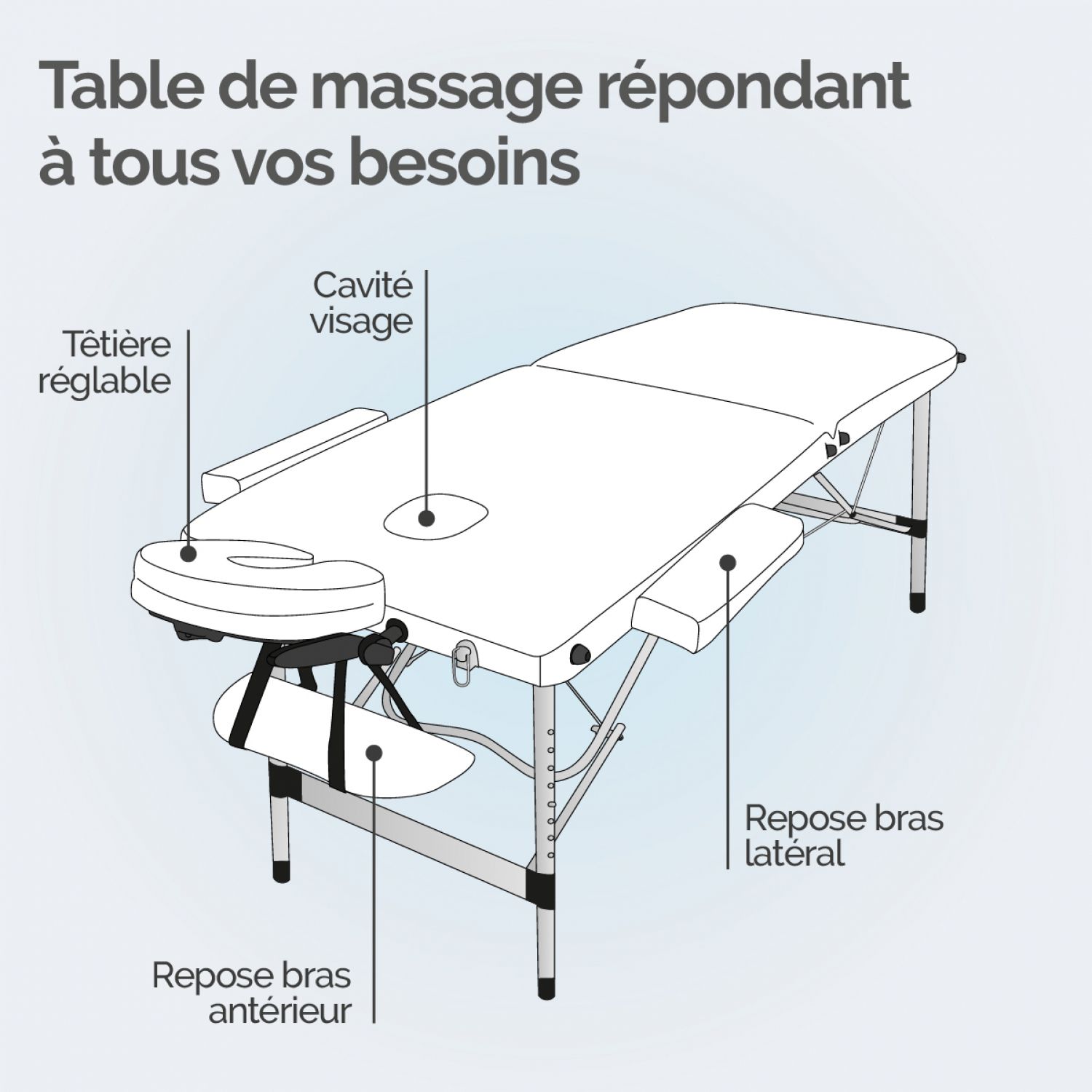 | Libellé | Vivezen - Table de massage pliante 2 zones en aluminium + Accessoires et housse de transport - Blanc |