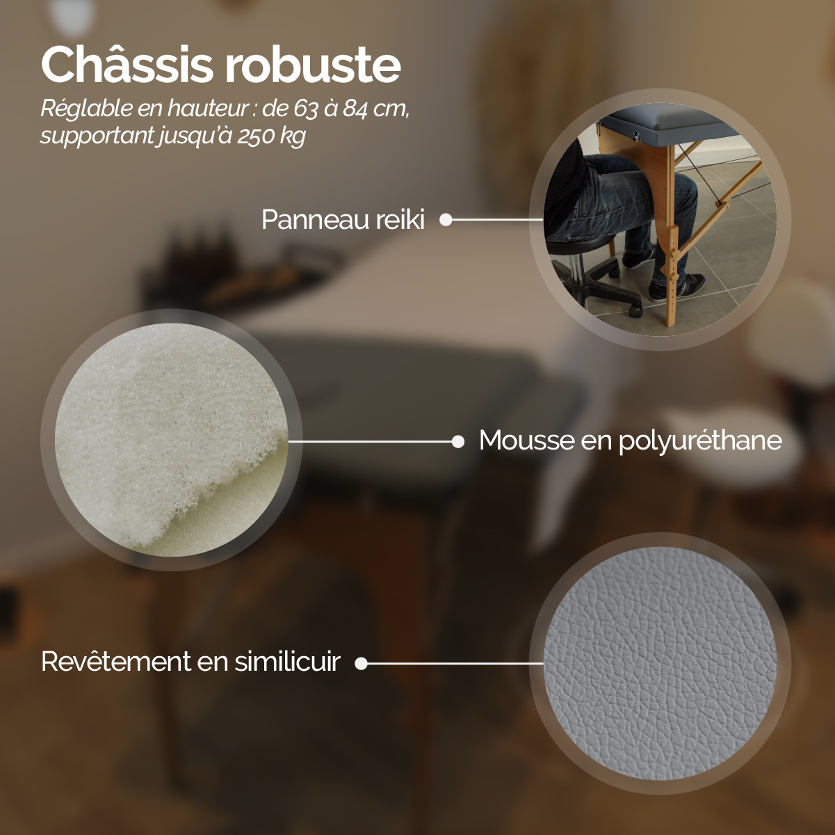 | Libellé | Vivezen - Table de massage pliante 2 zones en bois avec panneau Reiki+Accessoires et housse de transport - Gris |