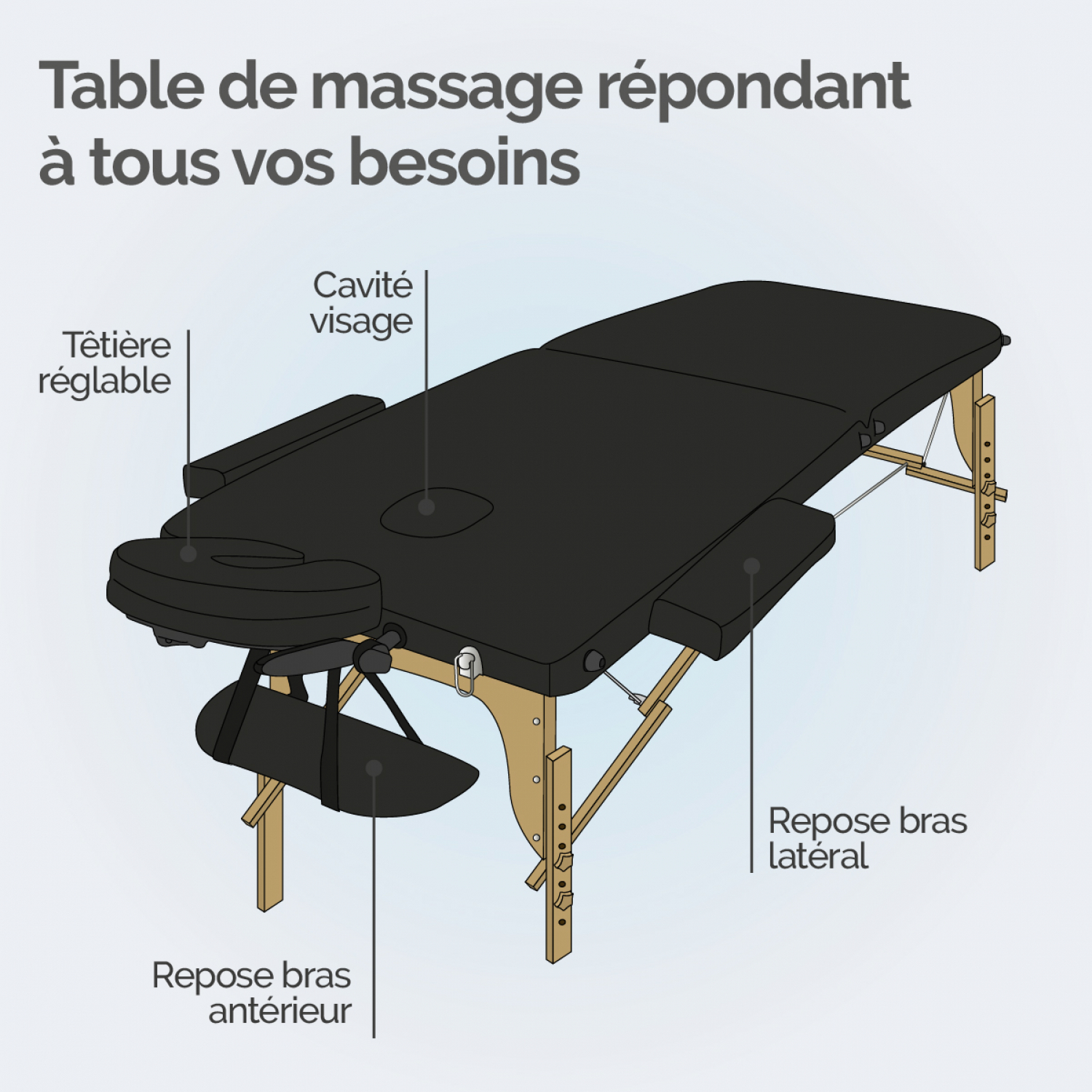 | Libellé | Vivezen - Table de massage pliante 2 zones en bois avec panneau Reiki+Accessoires et housse de transport - Noir |