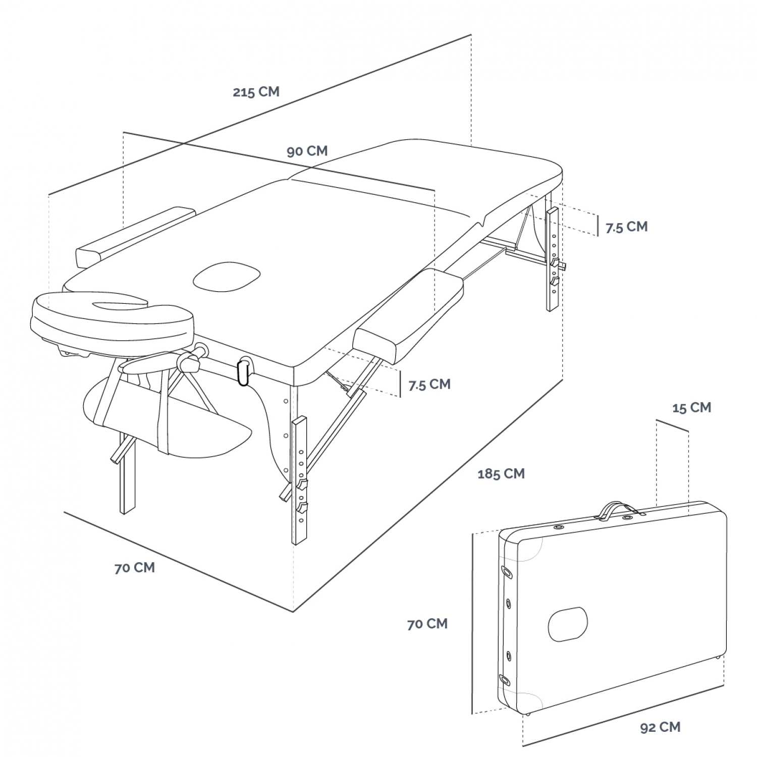 La table de massage 2 zones en bois Vivezen est conçue aussi bien pour les professionnels que pour les particuliers qui souhaitent faire du massage à domicile, elle combine tous les avantages d'une table fixe et d'une table pliante en un seul produit. La table dispose d'un revêtement en similicuir et d'une belle mousse épaisse en polyuréthane ayant une densité de 24 kg/m3. Confortable et esthétique, elle est d'une qualité professionnelle. Avec une structure en bois de hêtre et des câbles de support en acier, cette table de 13.8 kg est stable et robuste. Sans ses accessoires, cette table pèse 11.4 kg. Elle peut supporter jusqu'à 250 kg. Facilement transportable grâce à sa housse de transport, elle vous suivra de partout. Se pliant et se dépliant simplement, vous pouvez aussi ajuster la table de massage à votre guise avec un repose-bras antérieur, deux repose-bras latéraux, une têtière ainsi qu'une cavité visage, l'ensemble étant amovible, remplissant les besoins de chacun. La table 2 zones en bois est réglable en hauteur de 63 à 84 cm. La surface allongée sans appuie-tête et accoudoirs est de 185 x 70 cm, et la surface allongée avec appuie-tête et accoudoirs est de 215 x 90 cm. Épaisseur de la table (structure + mousse) : 7.5 cm. Plusieurs coloris disponibles.