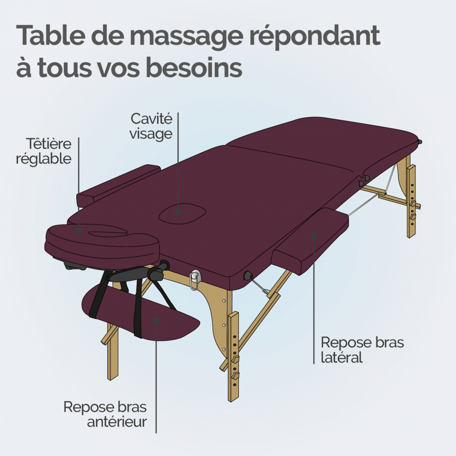 | Libellé | Vivezen - Table de massage pliante 2 zones en bois avec panneau Reiki+Accessoires et housse de transport - Prune |