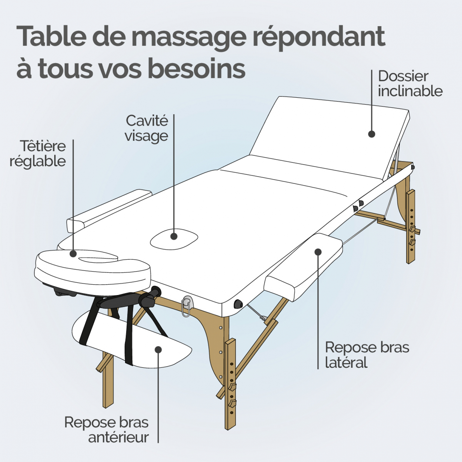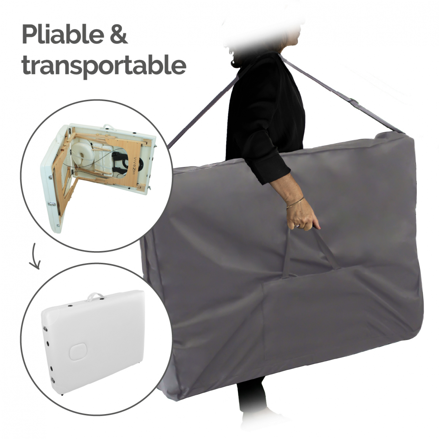 | Libellé | Vivezen - Table de massage pliante 3 zones en bois avec panneau Reiki + Accessoires et housse de transport - Blanc |