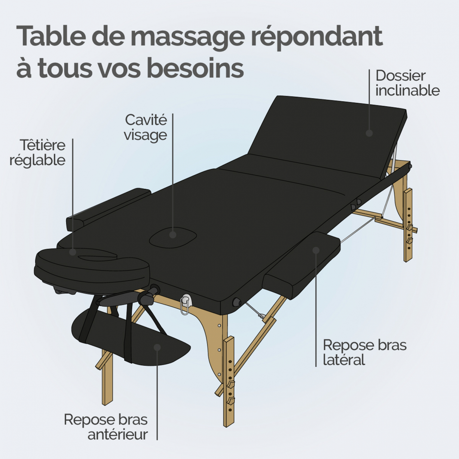 | Libellé | Vivezen - Table de massage pliante 3 zones en bois avec panneau Reiki + Accessoires et housse de transport - Noir |