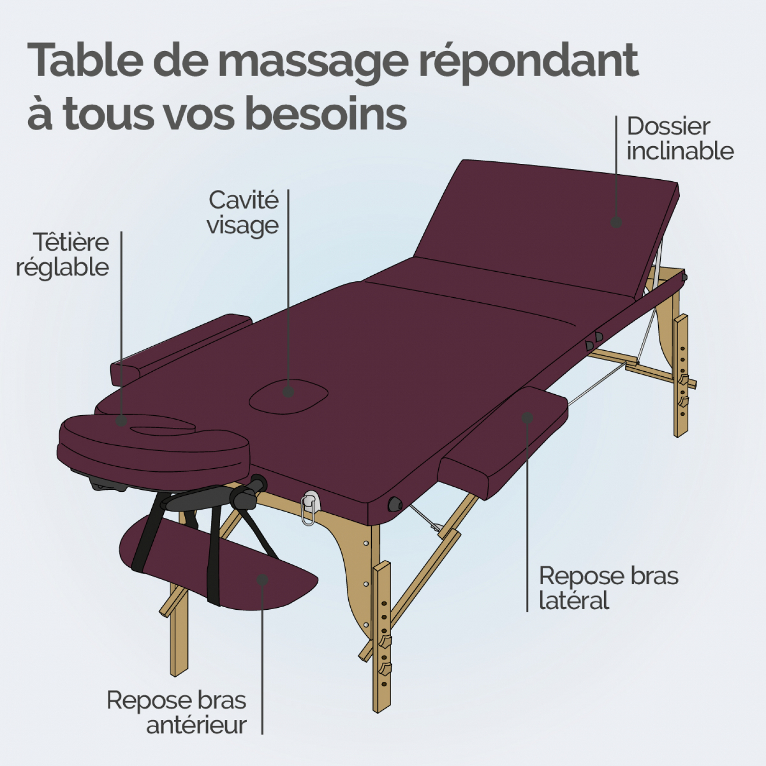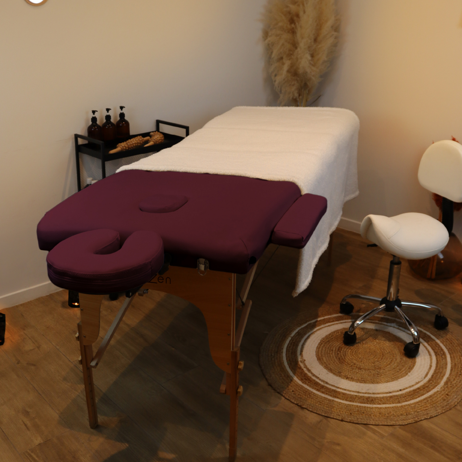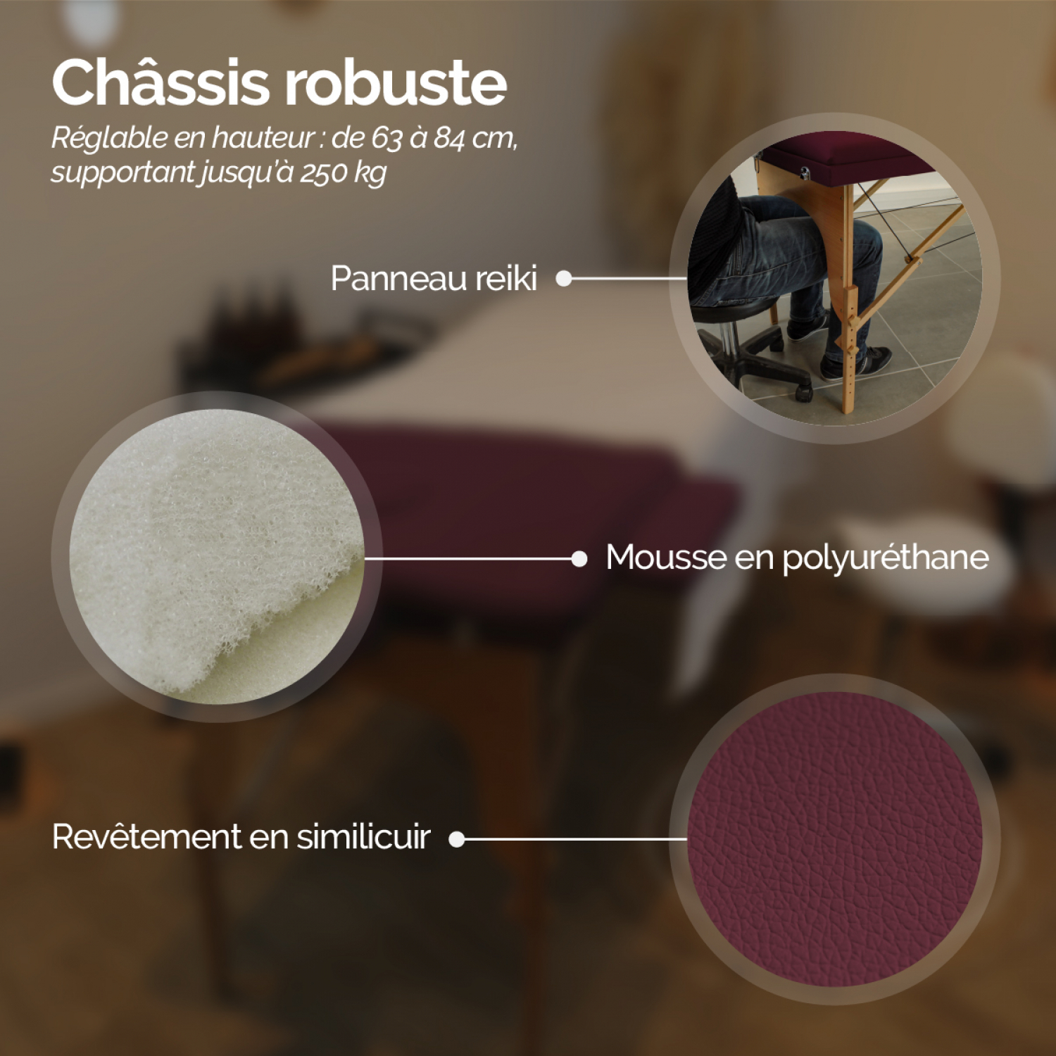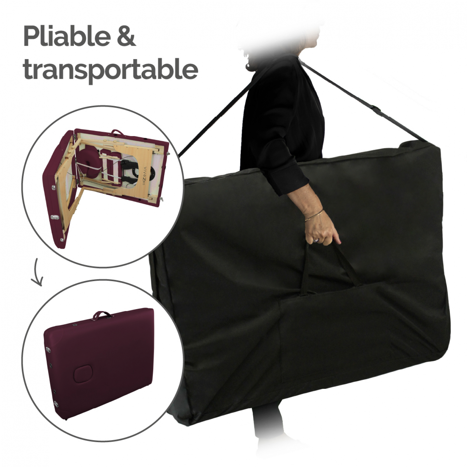 | Libellé | Vivezen - Table de massage pliante 3 zones en bois avec panneau Reiki + Accessoires et housse de transport - Prune |