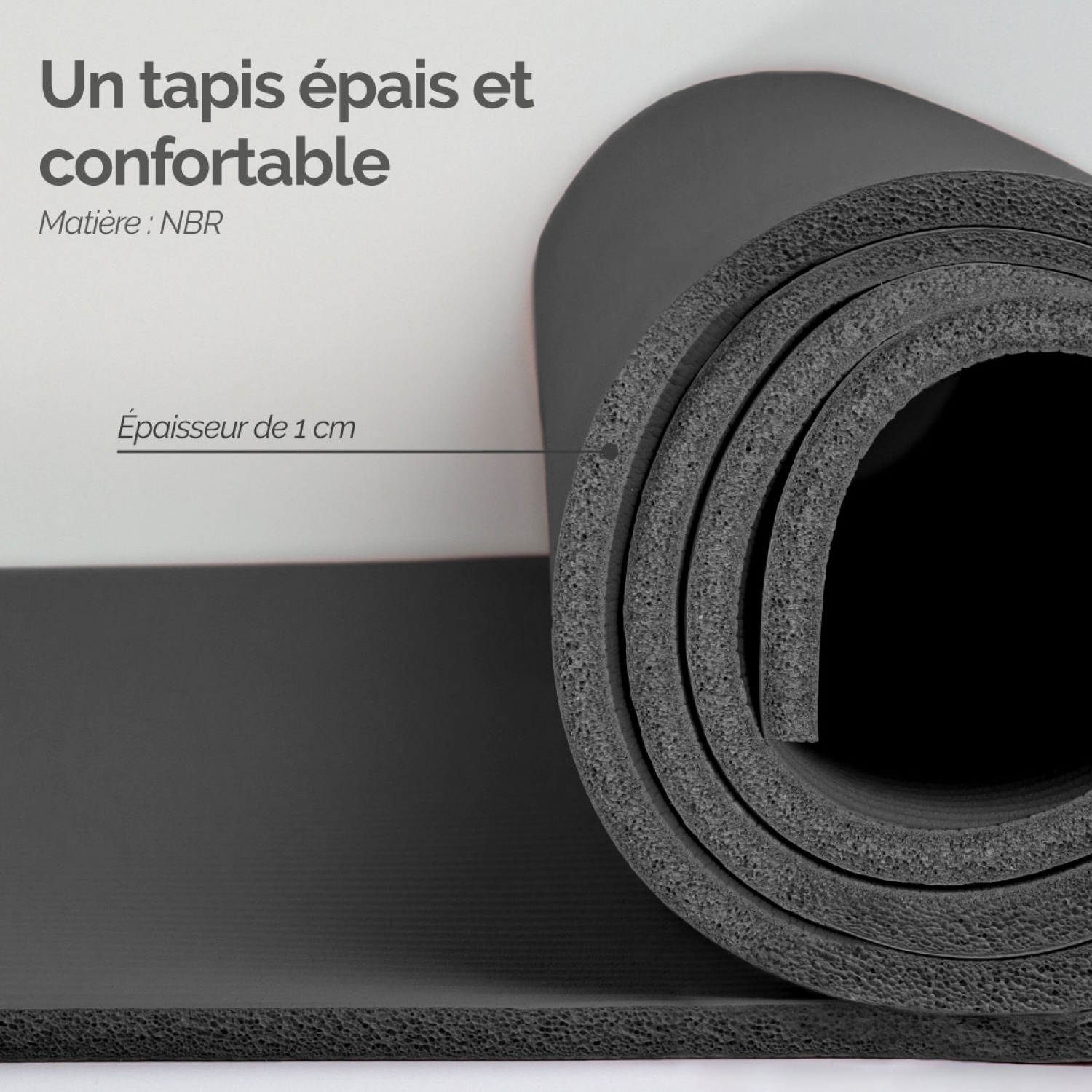 Idéal pour les activités comme le yoga, le pilates, le travail des abdominaux ou encore le renforcement musculaire. Le tapis de yoga se plie et se déplie très facilement, il suffit de le dérouler pour démarrer votre entraînement. Ce tapis de yoga fabriqué en NBR (caoutchouc butadiène nitrile acrylique) mesure 10 mm d'épaisseur, il est ainsi ultra confortable et moelleux, il protège des chocs et également de la fraîcheur du sol. Le tapis dispose d'une surface striée antidérapante qui aide à la stabilité permettant un entraînement en toute sécurité. Ce tapis de yoga mesure 180 cm de longueur par 60 cm de largeur. Fourni avec une sangle de transport. Existe en plusieurs coloris et également en taille 186 cm x 120 cm.