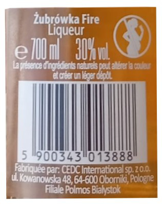 | Libellé | Vodka Zubrowka Fire, 30 % vol. - 70 cl |