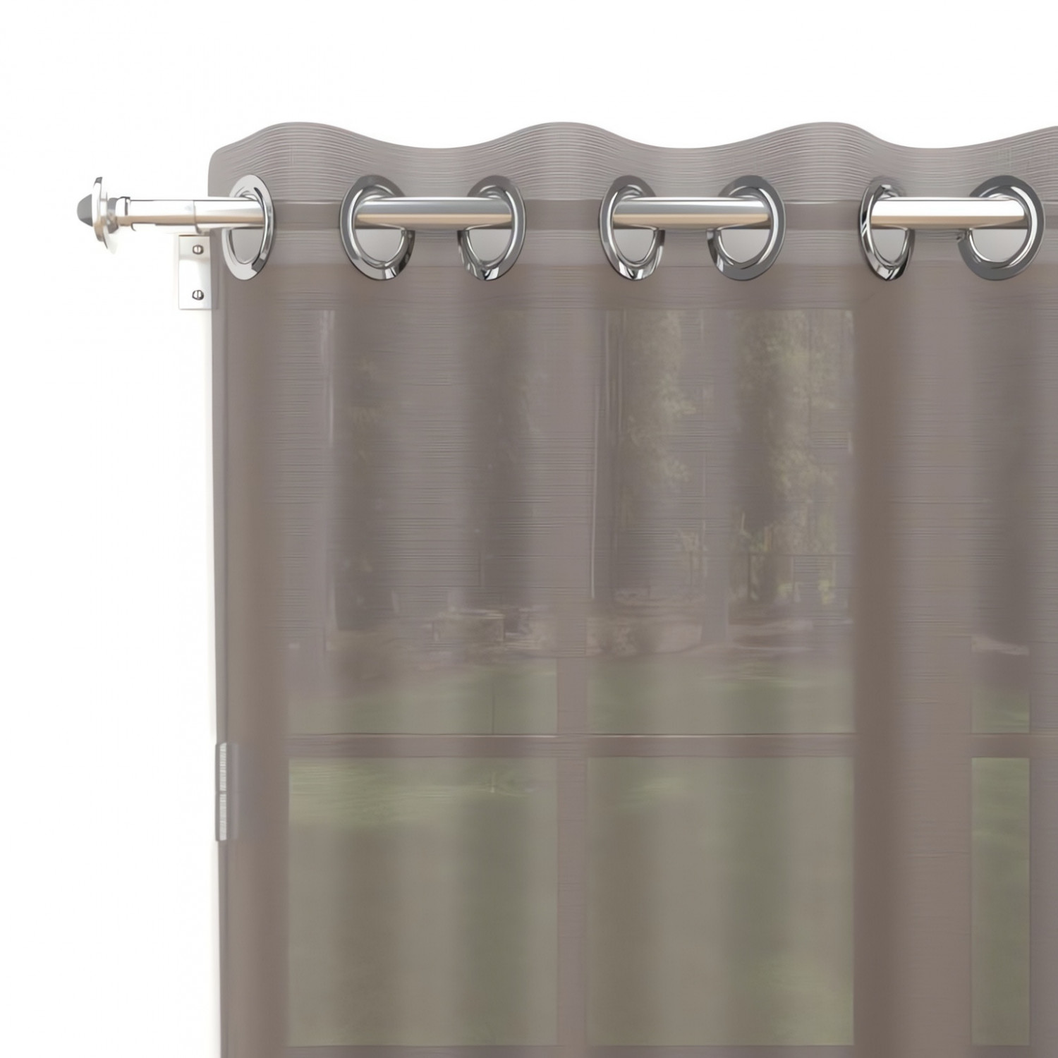 Voilage à oeillets uni, simple, et classique. Finition: 8 oeillets en métal inox (anti-rouilles). Prêt a poser. Couleur: Moka. Composition: 100% polyester. Dimensions: 135x250 cm. Entretien: - entretien facile, repassage inutile. - lavable en machine 30°c.