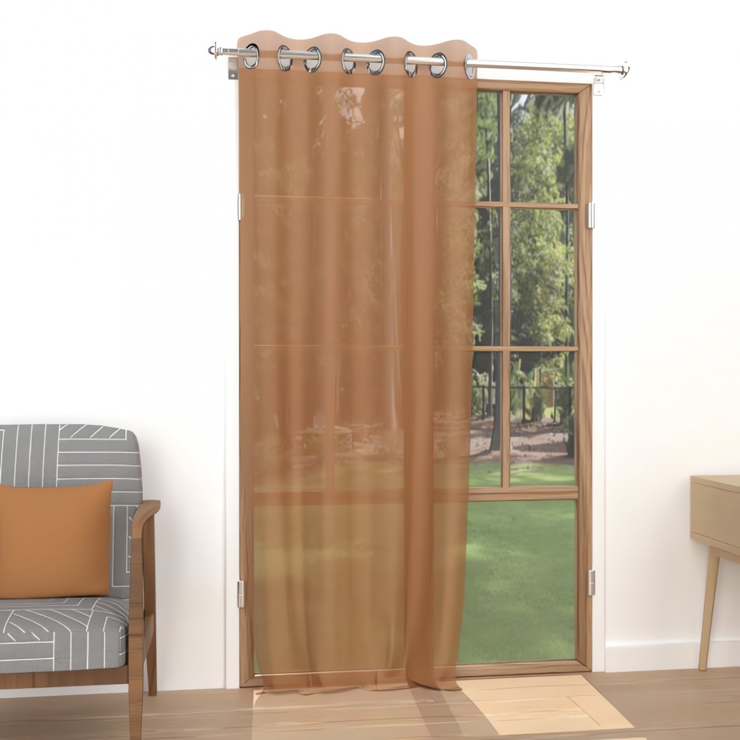 Voilage à oeillets uni, simple, et classique. Finition: 8 oeillets en métal inox (anti-rouilles). Prêt a poser. Couleur: Ocre. Composition: 100% polyester. Dimensions: 135x250 cm. Entretien: - entretien facile, repassage inutile. - lavable en machine 30°c.