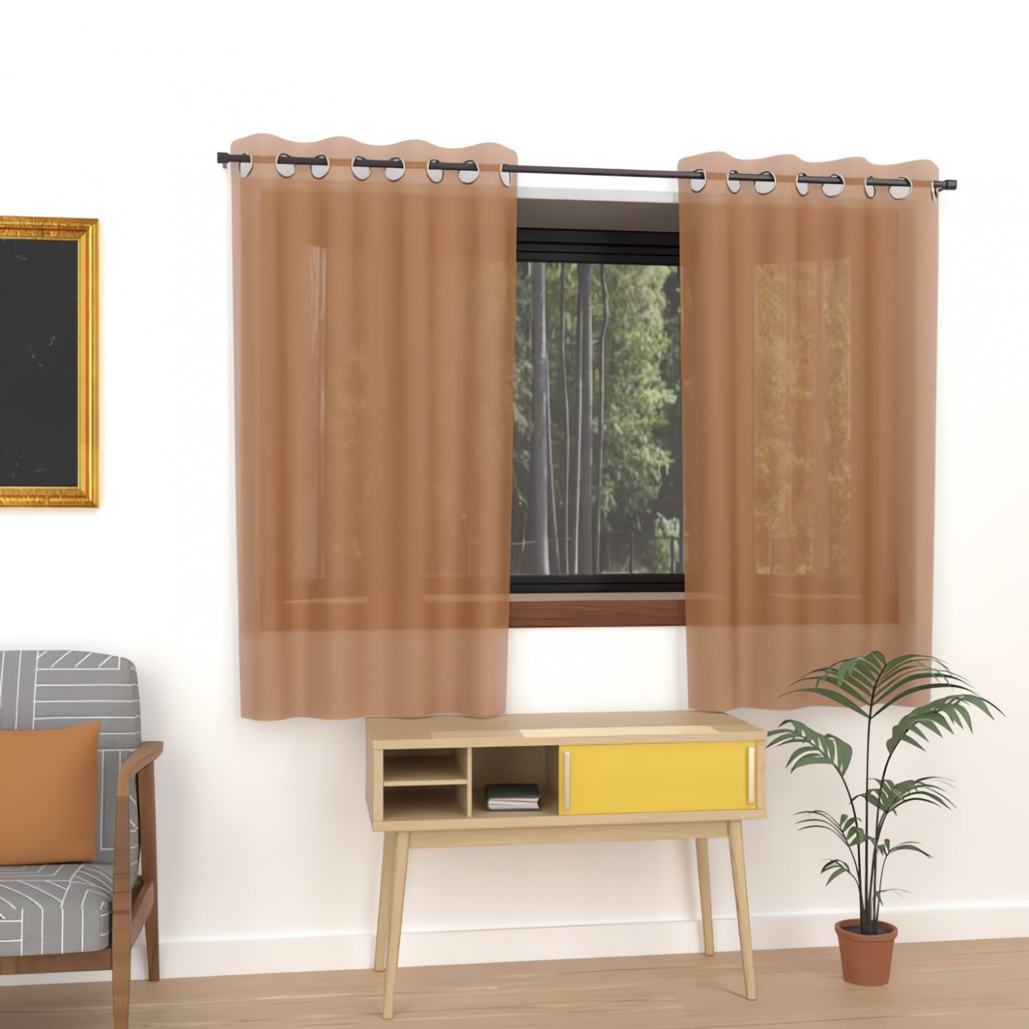 Rideau à oeillets uni, simple, et classique. Taille spéciale pour les fenêtres avec radiateur. Finition: 8 oeillets en métal inox (anti-rouilles). Prêt a poser. Couleur: Ocre. Composition: 100% polyester. Dimensions: 135x180 cm. Entretien: - entretien facile, repassage inutile. - lavable en machine 30°c.