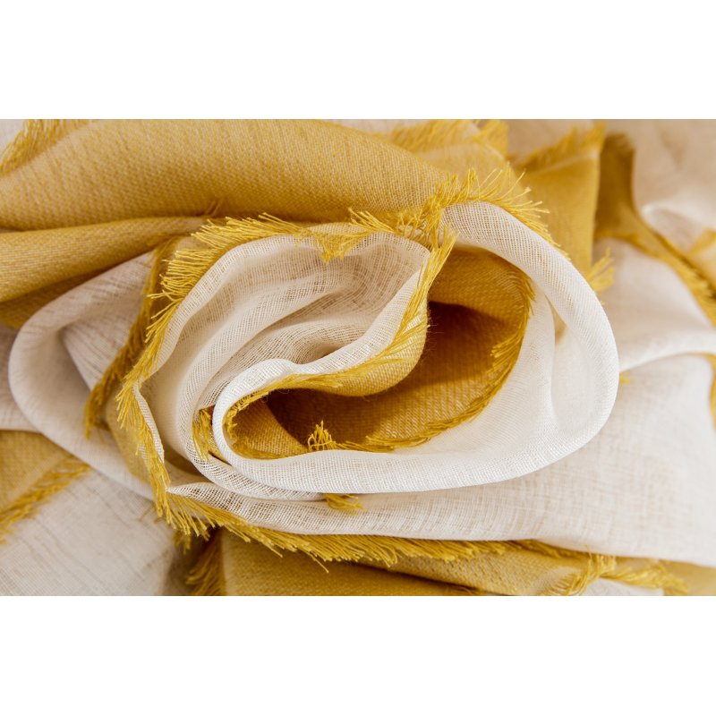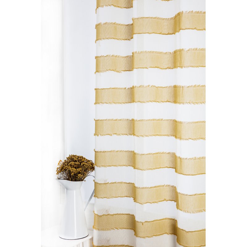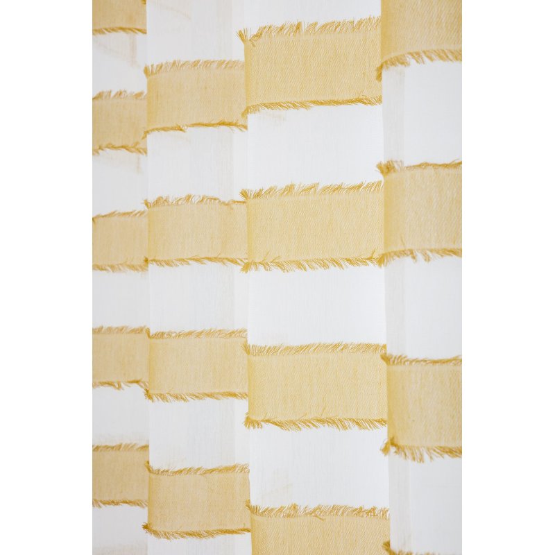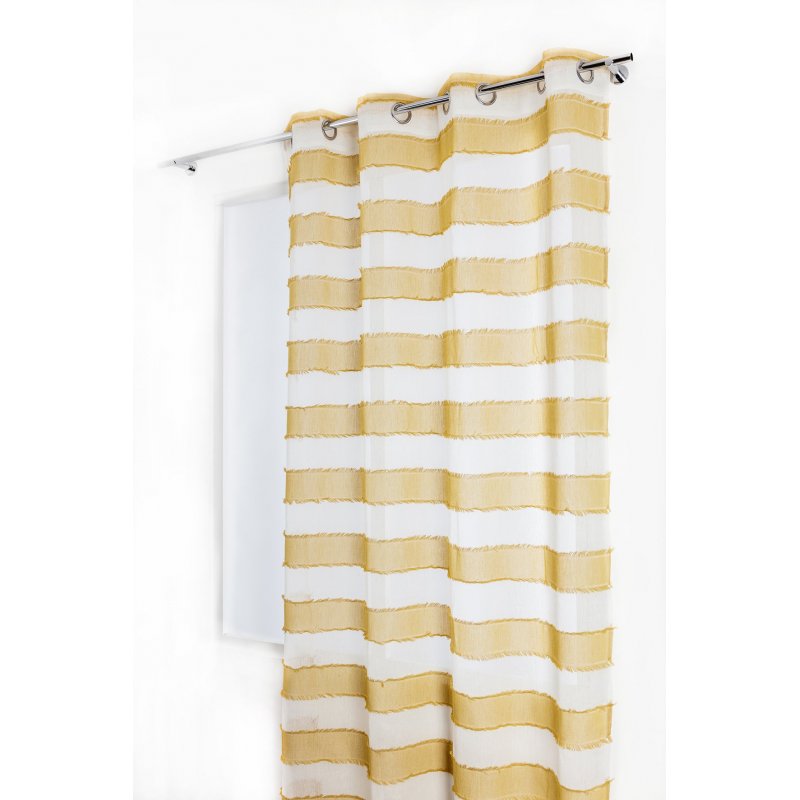 Voilage à oeillets tamisant tissé à rayures horizontales jaunes avec franges. Un voilage cosy qui apportera une touche de soleil dans votre salon ou chambre.