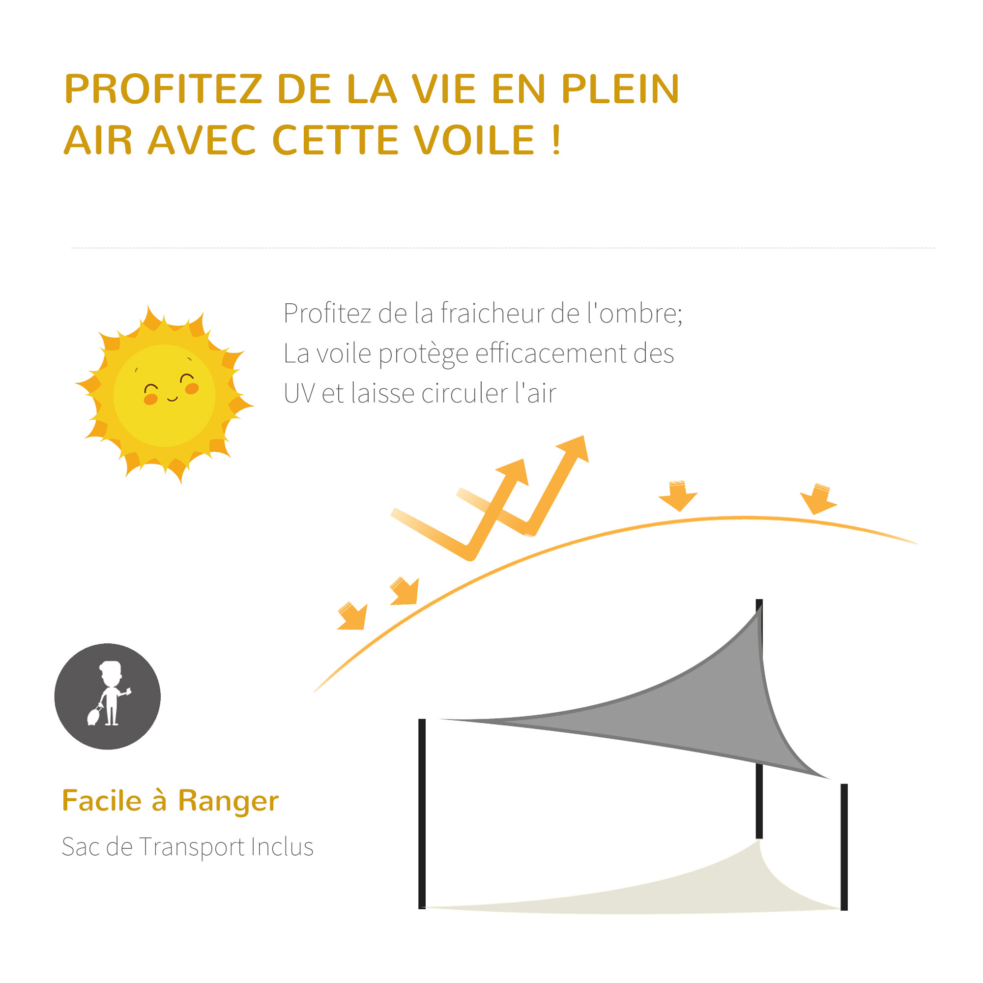 Ce superbe voile d'ombrage triangulaire grande taille 5 x 5 x 5 m est un accesssoire de décoration extérieure élégant et très utile pour se protéger des rayons du soleil. Vous pourrez ainsi apporter une touche de couleur et de gaieté supplémentaire à votre jardin. De quoi se constituer un véritable petit coin ombragé très apprécié de tous par temps ensoleillé et chaud.