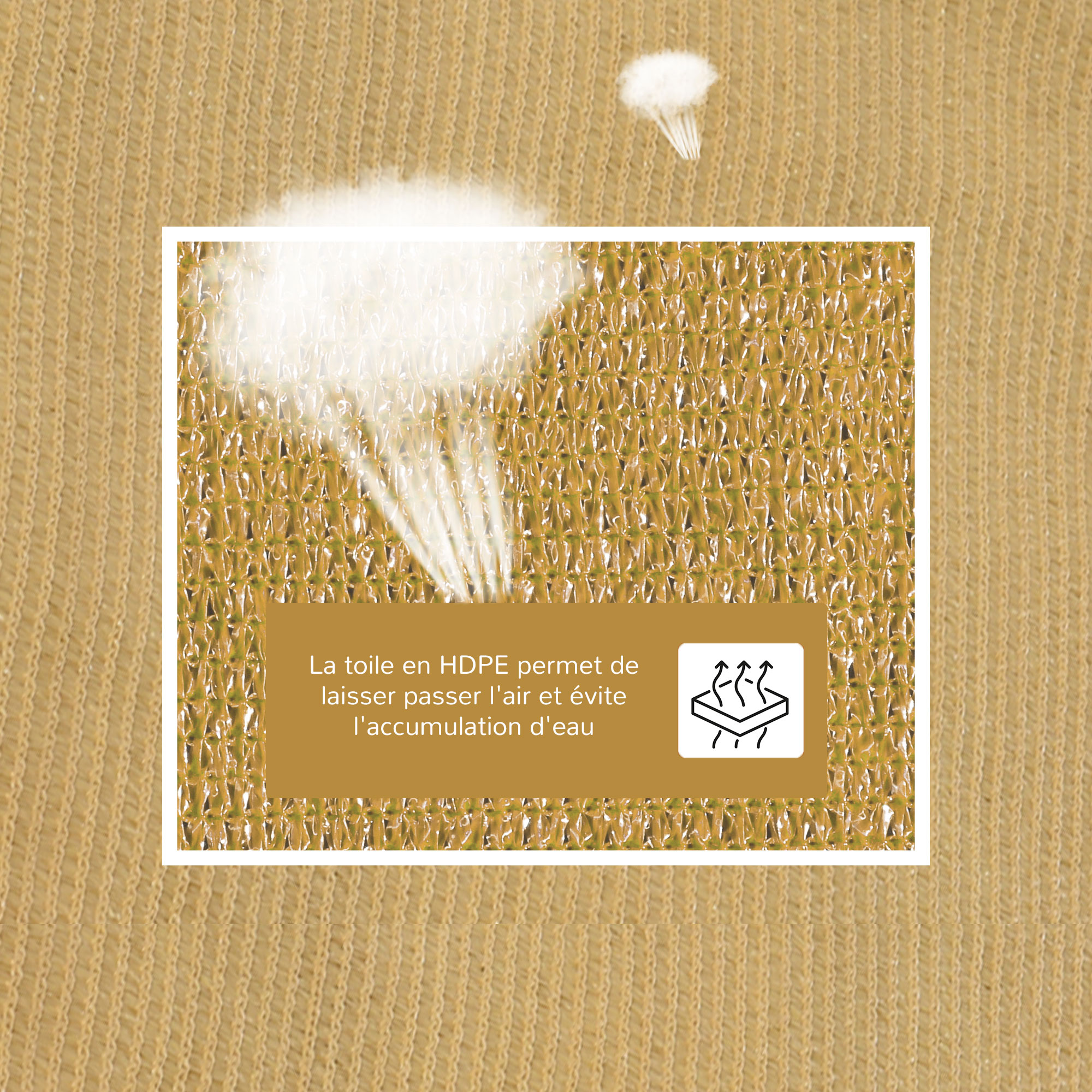 - HDPE haute densité 185 g/m² bloquant jusqu'à 90 % des UV et favorisant la sensation de fraicheur et bien-être, de plus, très durable et robuste