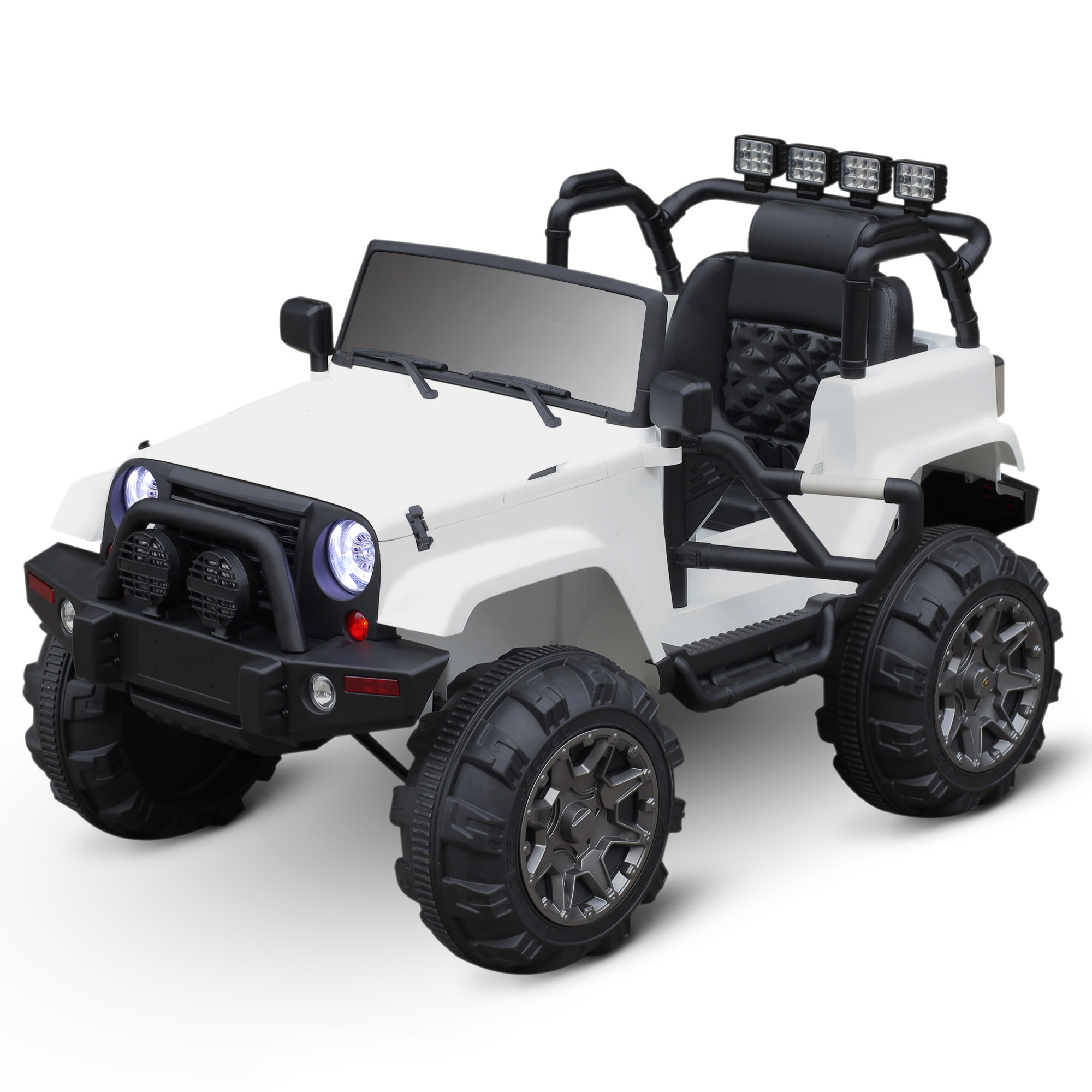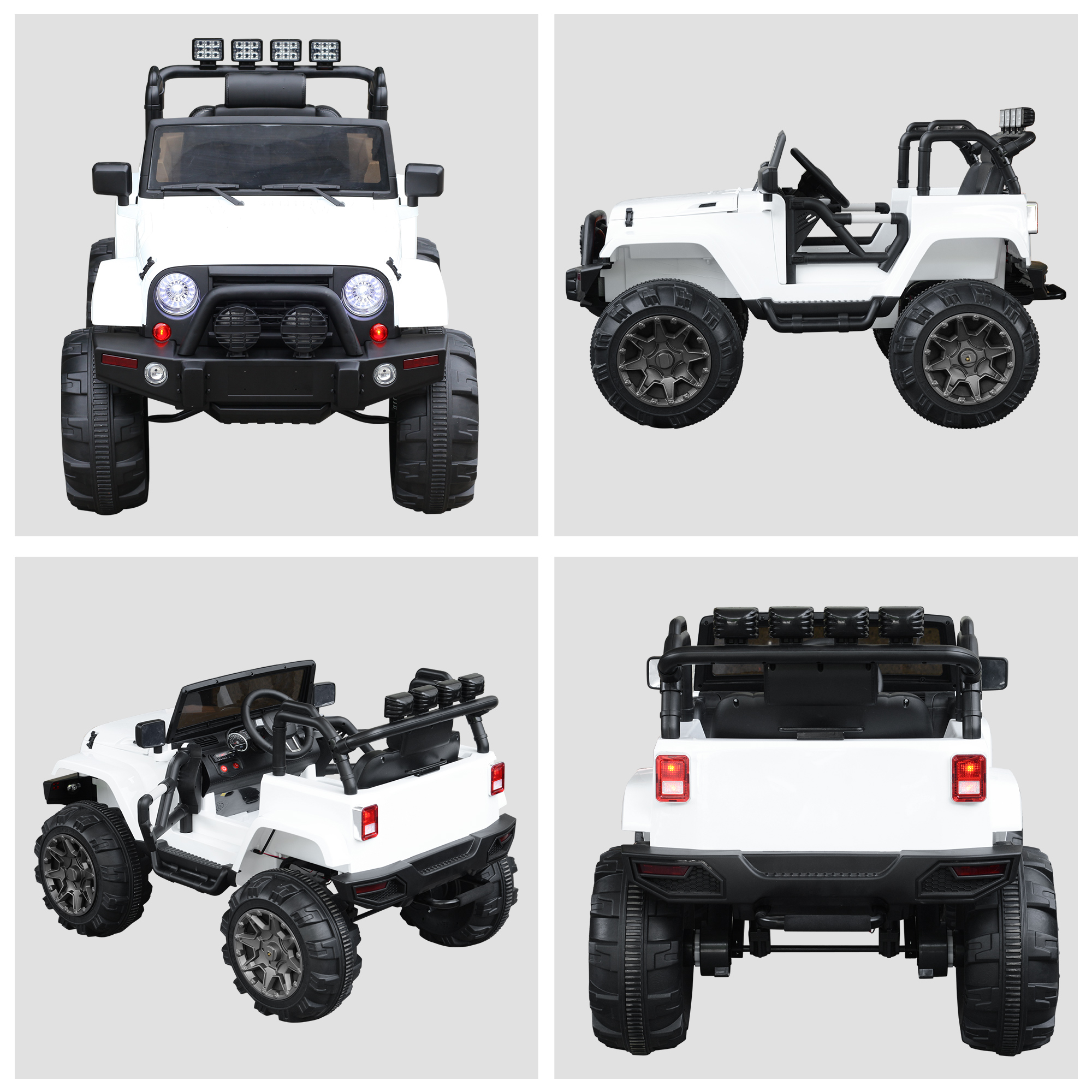 - Multiples options, effets lumineux et sonores : phares LED, 4 projecteurs, klaxon, lecteur MP3 multifonction (interface USB, fonction radio, écran pour carte TF), etc...