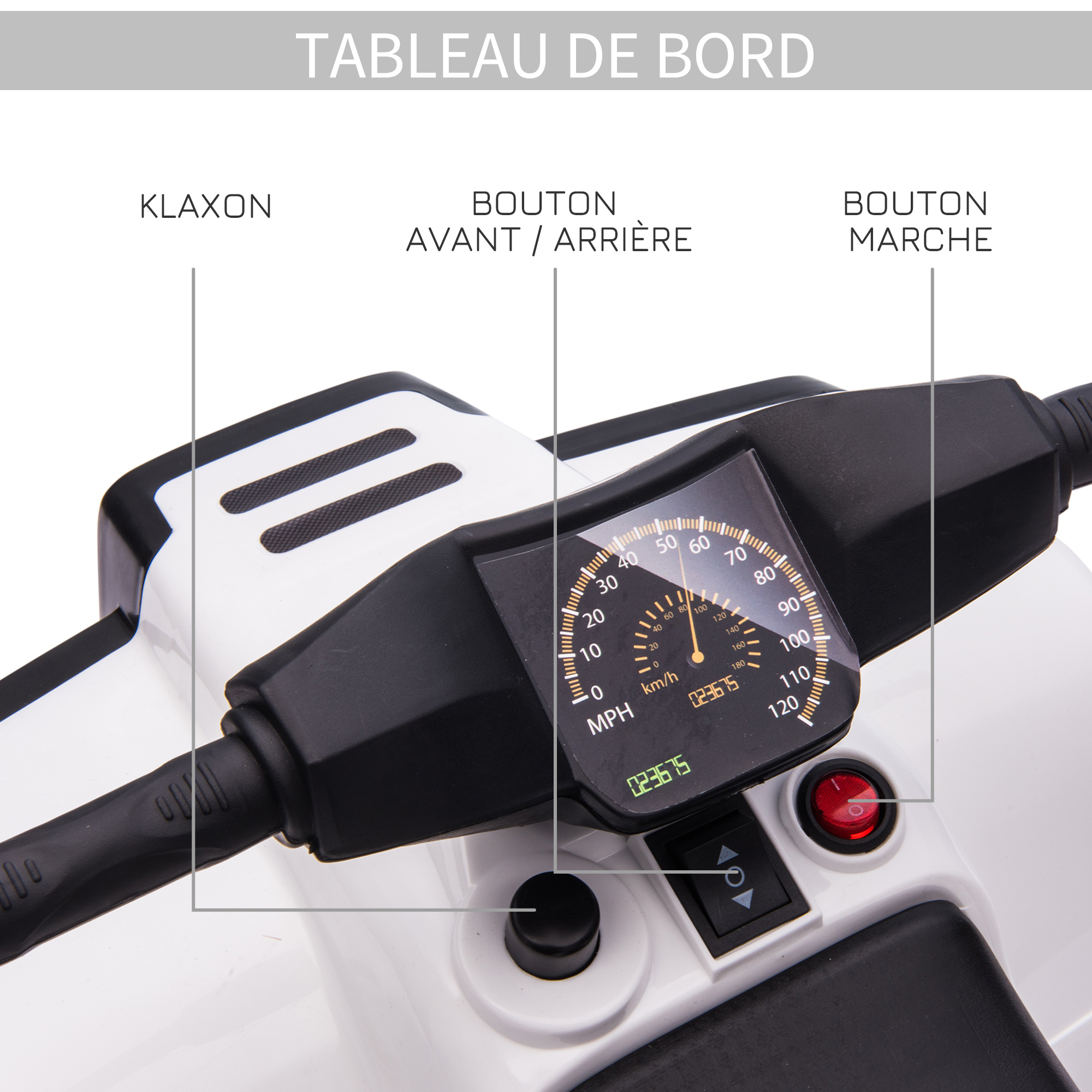| Libellé | Voiture 4x4 quad buggy électrique enfant 18-36 mois 6 V 3 Km/h max. effet lumineux sonores métal PP blanc noir |