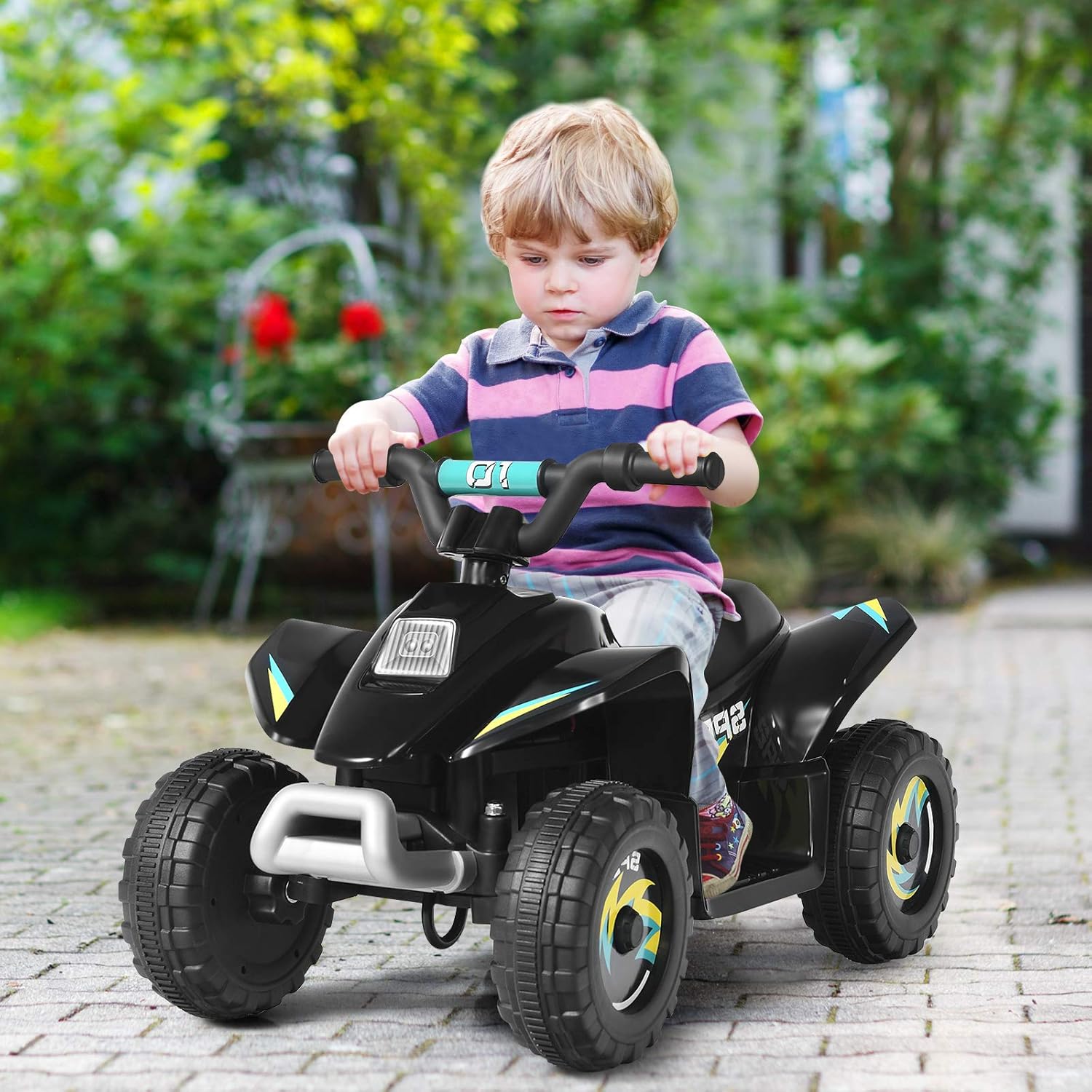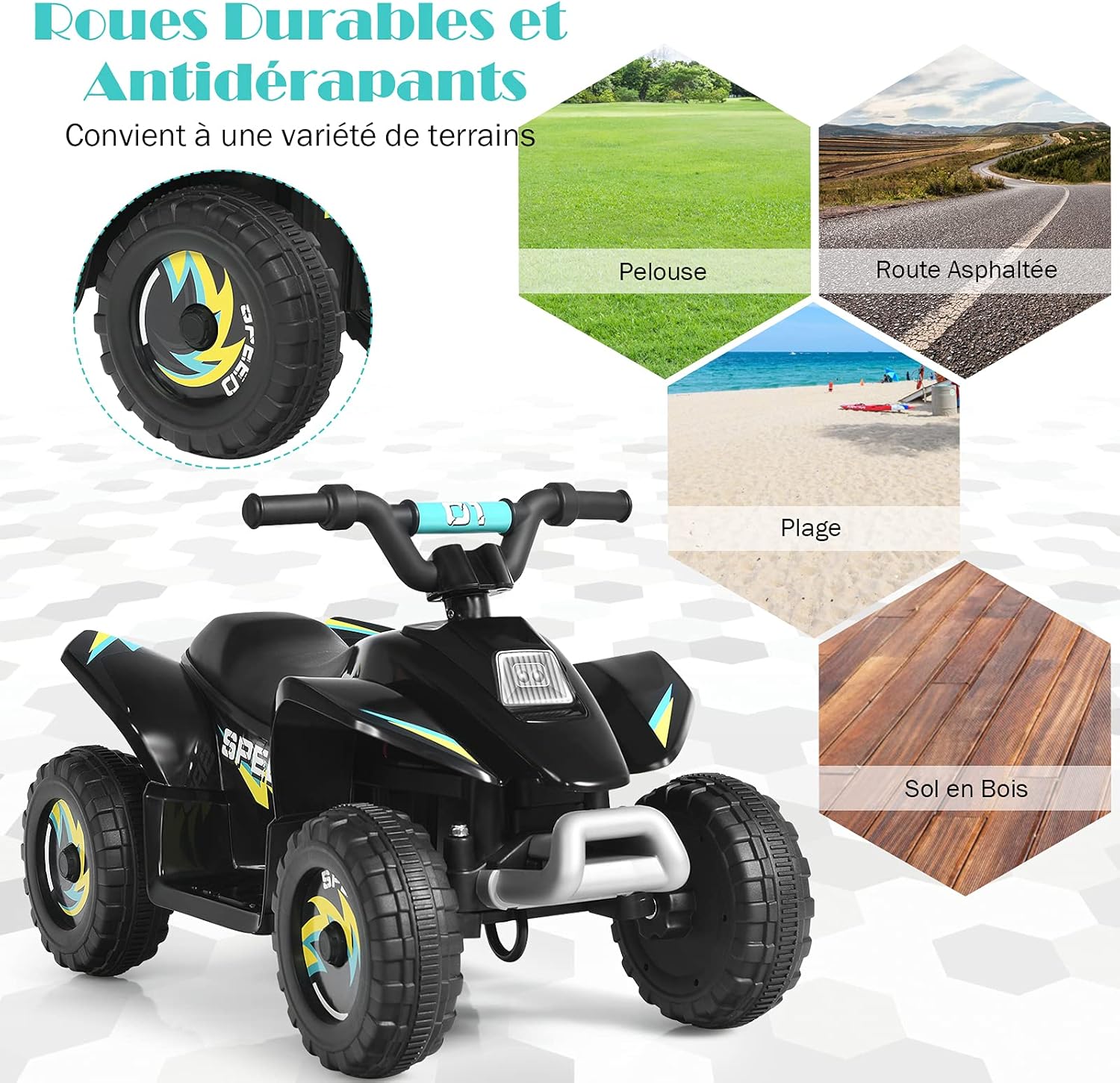 - Roues résistantes à l'usure : Equipées de 4 grandes roues, la balade en quad dispose d'un centre de gravité bas, pour offrir une expérience de conduite stable. Pendant ce temps, les roues offrent une plus grande résistance à l'abrasion. De cette façon, les enfants peuvent le conduire sur différents terrains, à l'intérieur ou à l'extérieur.