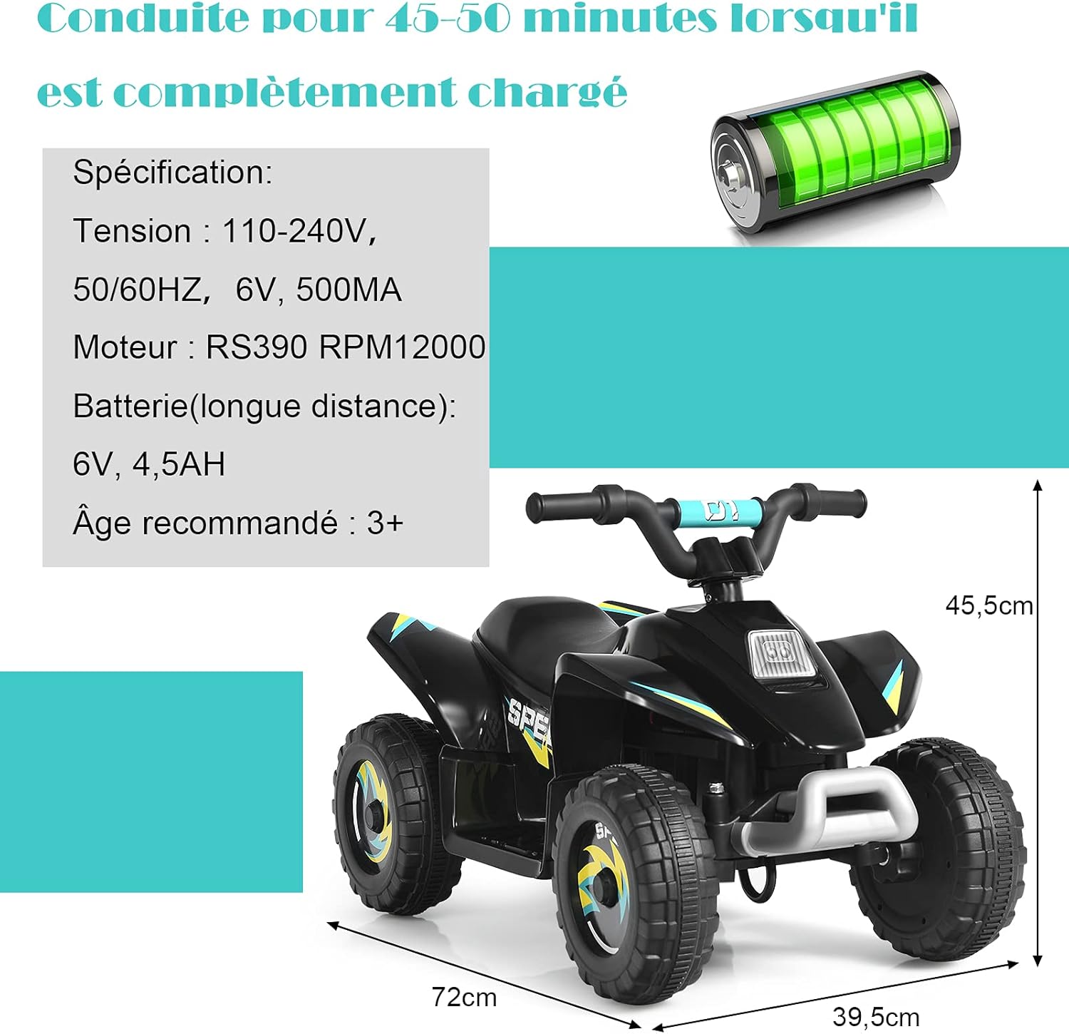 - Batterie rechargeable avec une durée de fonctionnement plus longue : Elle est livrée avec un adaptateur qui vous permet de recharger le véhicule à temps. De plus, le quad alimenté par batterie dure environ 50 minutes après une charge complète, ce qui permet à vos enfants de le conduire selon leurs préférences.