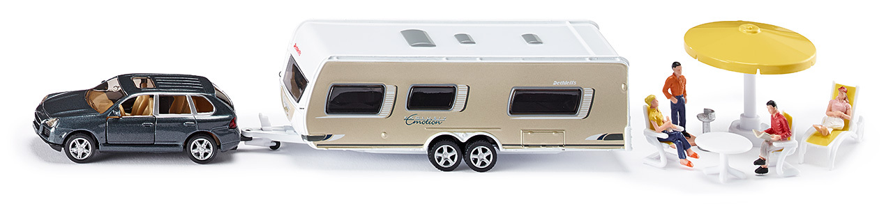 Combinaison d'une Porsche Cayenne Turbo comme véhicule de traction avec le Camping Car « Exclusiv Emotion » de Dethleffs et accessoires en nombre. La Porsche Cayenne noire a encore été améliorée techniquement sur le plan de l'impression. La mise en 'uvre complexe de nombreux petits détails sur le Camping Car Dethleffs ainsi que l'impression généreuse du modèle laissent entrevoir que ce jouet pourrait également avoir bonne allure dans une vitrine de collectionneur. Une particularité supplémentaire du Camping Car est son toit amovible. Il est ainsi possible grâce aux figurines comprises dans le volume de livraison de jouer des scènes même à l'intérieur du Camping Car. Au-delà des différentes figurines se trouvent également à bord un équipement de Camping Car pour ainsi dire au complet comprenant 2 chaises de jardin, une table, un parasol, une chaise-longue et un gril.