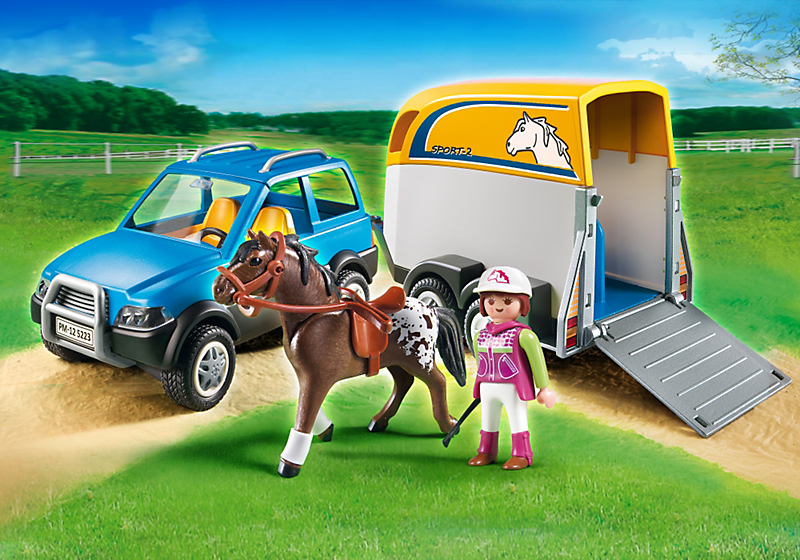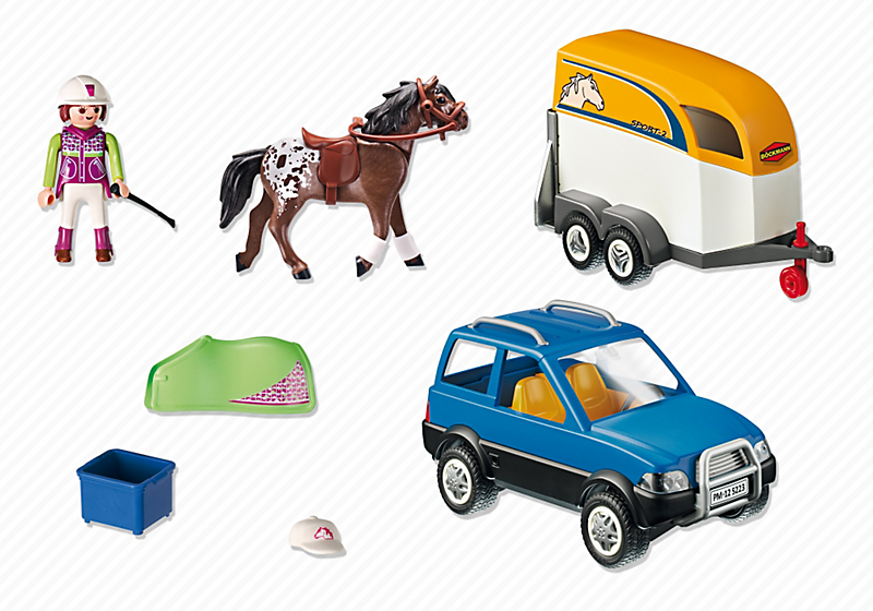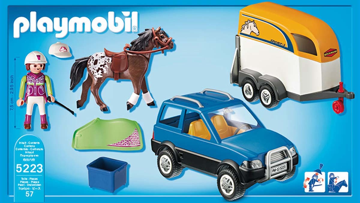 | La boîte contient | - Un personnage de cavalière - Une voiture - Une remorque pour deux chevaux - Un cheval - Divers accessoires dont une casquette, une cravache et une selle. |