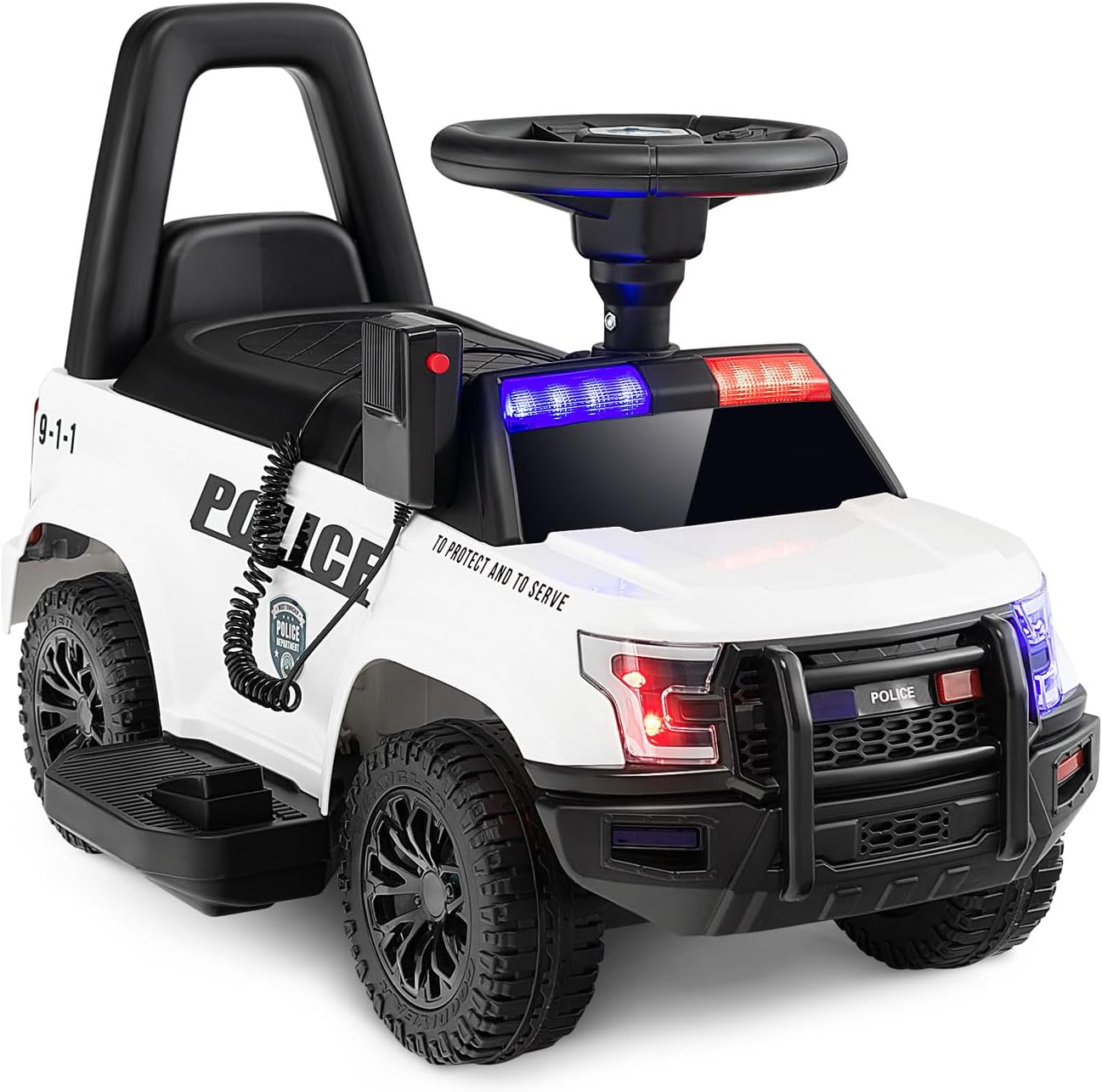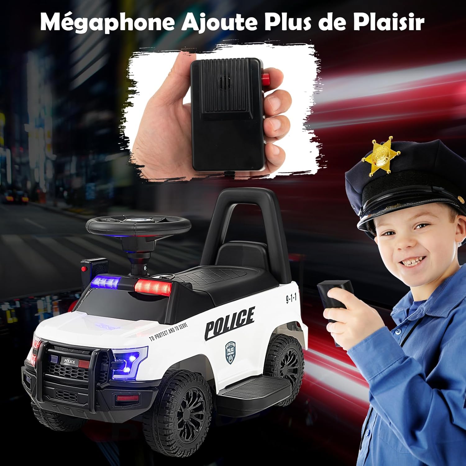 Ce jouet de conduite présente un aspect réaliste de voiture de police, des sirènes authentiques et des feux de signalisation clignotants. Après un montage simple, les enfants peuvent monter sur la voiture et la contrôler facilement grâce à la pédale ou aux boutons de commande manuelle. Le volant flexible permet également aux enfants de tourner à droite ou à gauche. Sous le volant, il y a un lecteur multimédia avec plus de fonctions intéressantes. Et le mégaphone inclus ajoute plus de plaisir à votre enfant. De plus, la structure stable avec 4 roues de haute qualité et le dispositif anti-basculement protégeront les enfants.
