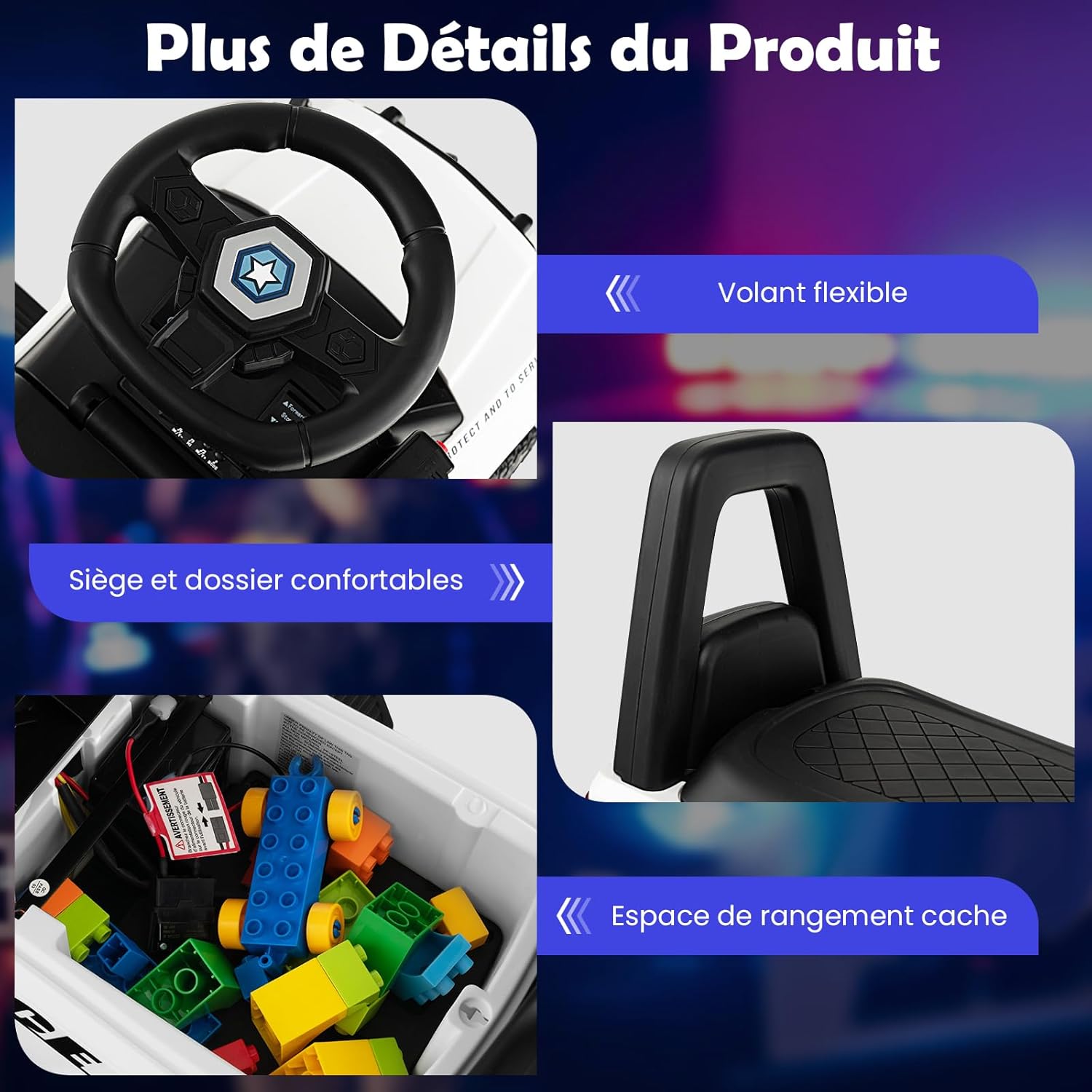 | Libellé | Voiture de police électrique enfants voiture électrique à batterie de 6v mégaphone sirène lumières,blanc |